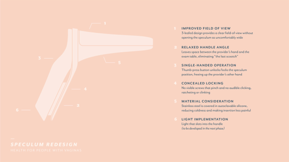 Still, while the design resembles the specula of old, the designers came up a few tweaks to help women feel more comfortable. Yona is covered with the silicon used in vibrators and sex toys (the designers even took a trip to San Francisco sex store staple Good Vibrations for research purposes). Changing the angle between the handle and the bill from 90 degrees to 105 degrees meant doctors could operate the device further away from the exam table, which eliminated the last scooch toward the doctor–an awkward repositioning before the speculum is inserted that patients said often made them feel incredibly vulnerable, exposed, and embarrassed. And the bill itself is now composed of three leaves, which the designers say means the doctor doesn’t have to open it quite so far to get the same access.