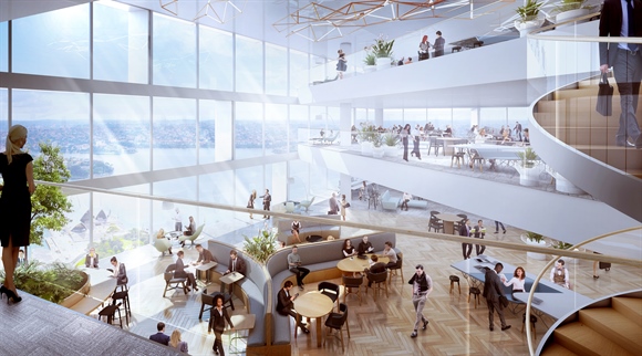 Rotating the tower also creates a collection of exterior terraces that are directly linked to the multi-level interior atria, which will contain shared amenity spaces for tenants in each block. These common amenity spaces provide stunning views both vertically and horizontally and bring daylight deep into workspaces while promoting collaboration and interaction.