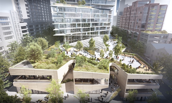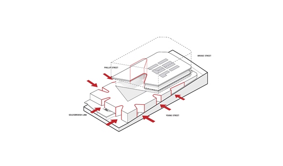 3XN’s design incorporates 2/3 of the structure of an existing building located on the site. The AMP Centre located at 50 Bridge Street which dates to 1976, was in need of a significant upgrade to meet modern market demands. In an act of radical sustainability, 3XN will incorporate the majority of the existing structure, adding four new elevator shafts to the core. Given the solar envelope and other contextual restraints, the design adds approximately 45,000m2 of new construction primarily on the north side of the building. The design optimizes the embodied energy and resources inherent in existing building and results in a remarkably efficient plan.