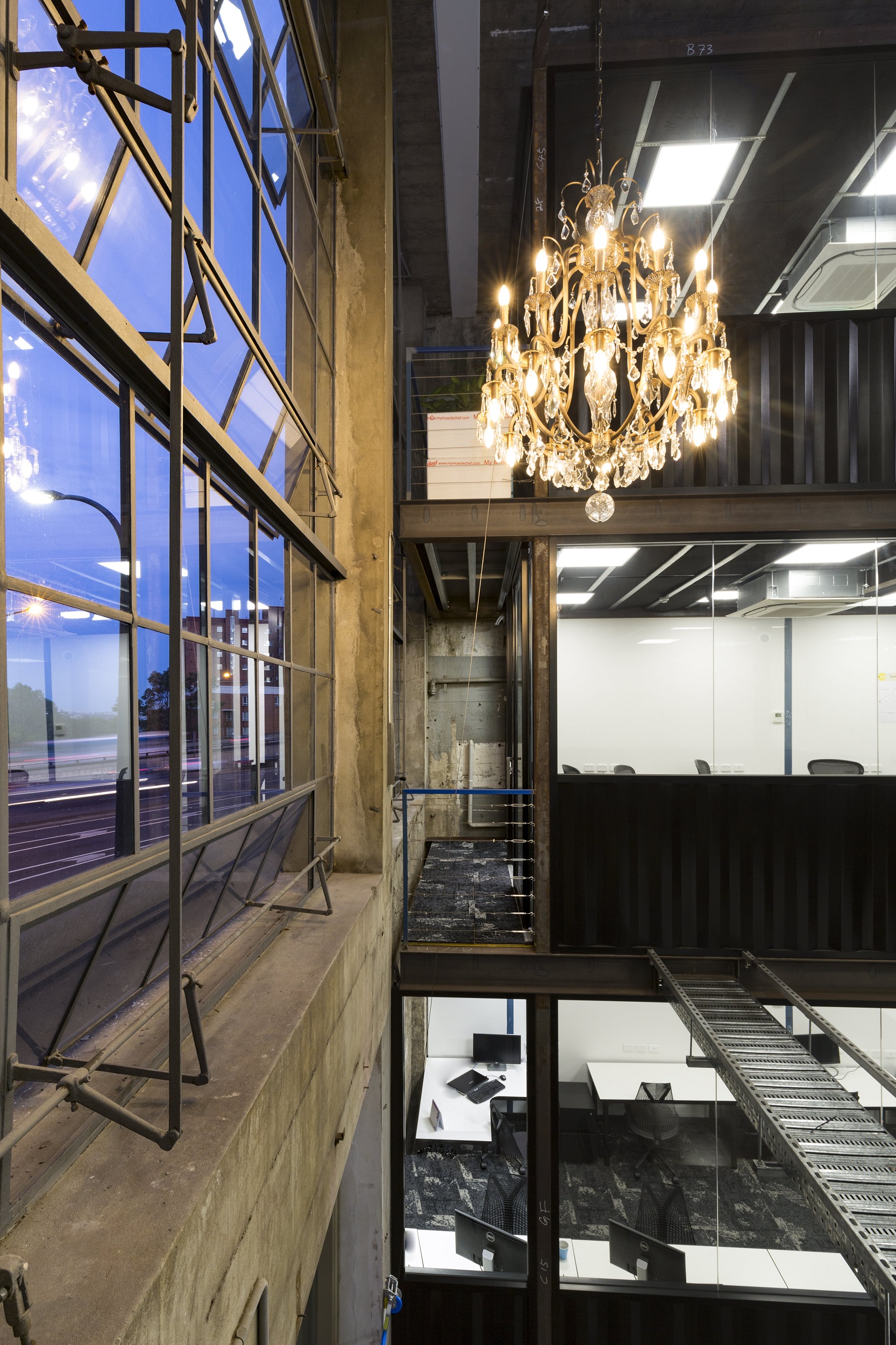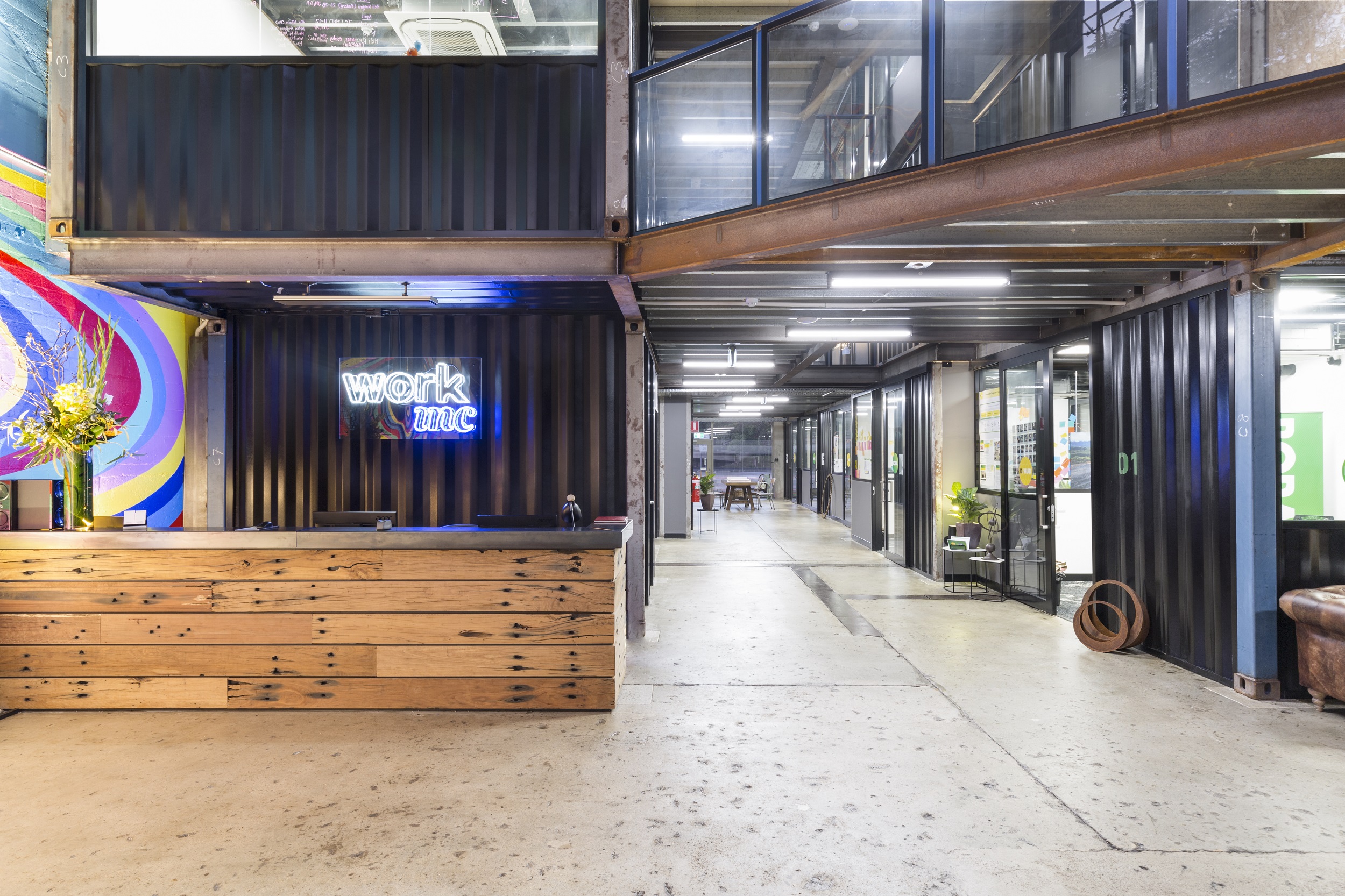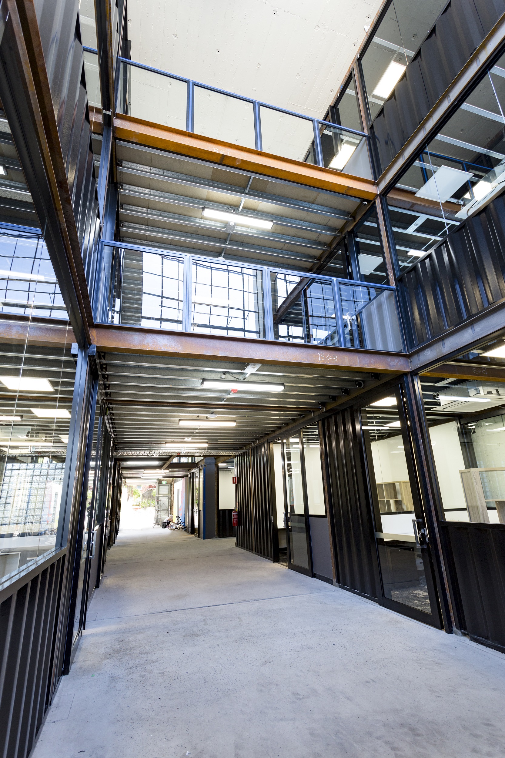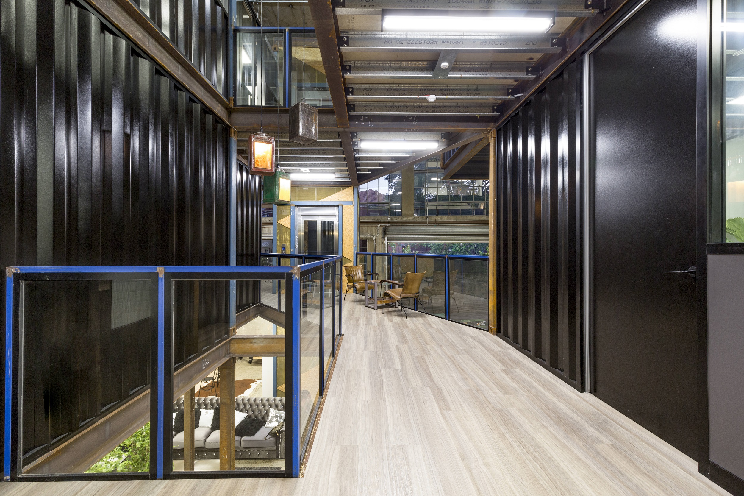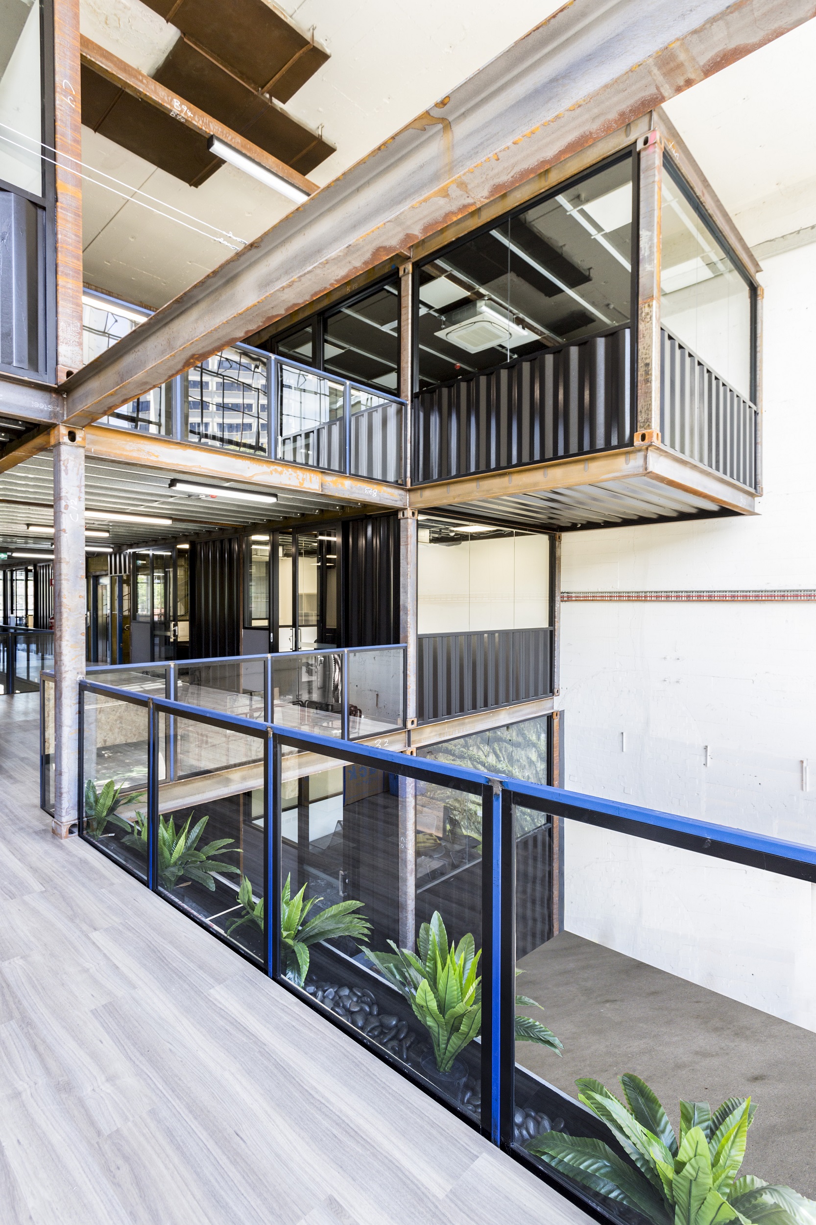 Given such an onerous condition of construction and in order to create a unique feel for the space, the design team utilised shipping containers to create each individual office. Reclaimed steel was then sandblasted and refinished to create the supporting structure for each level of containers.