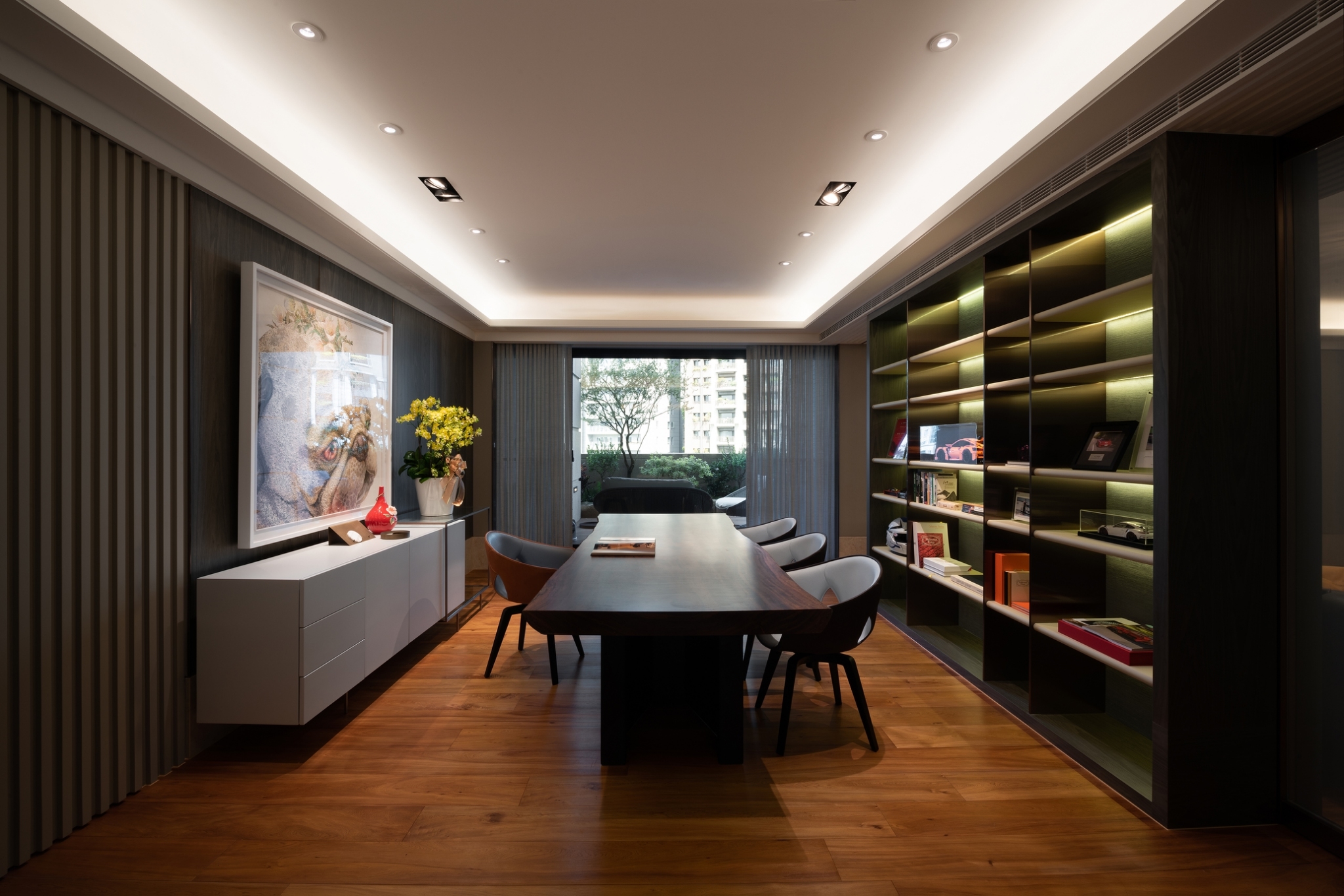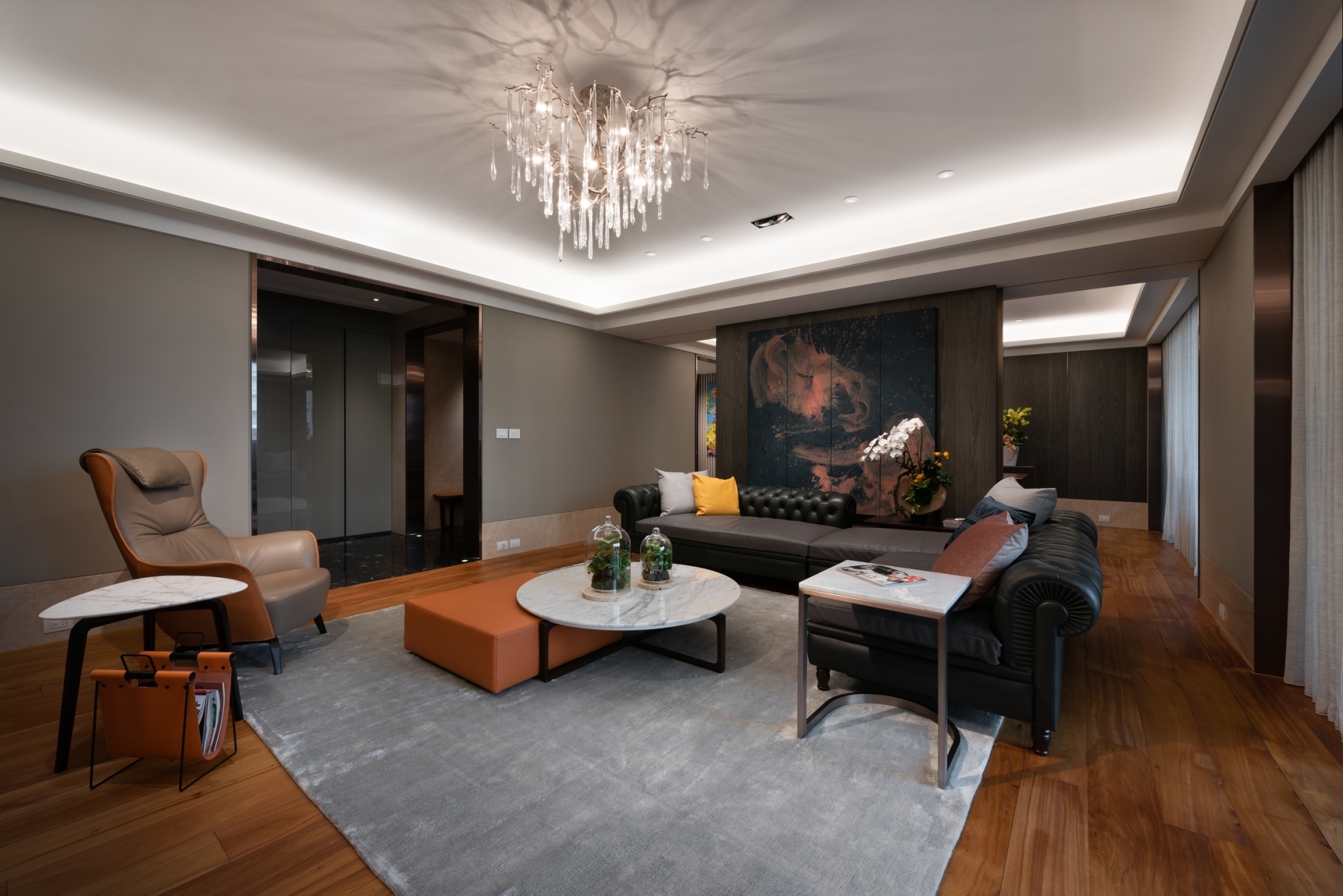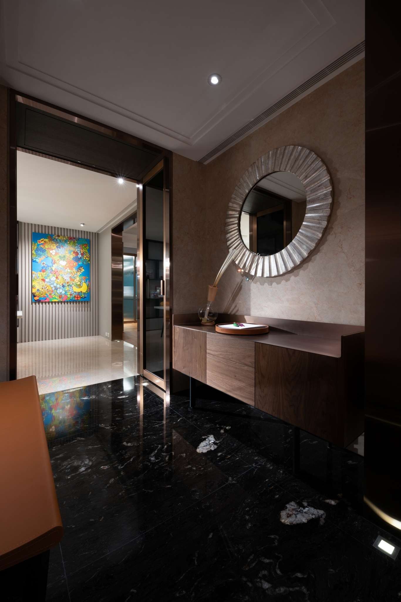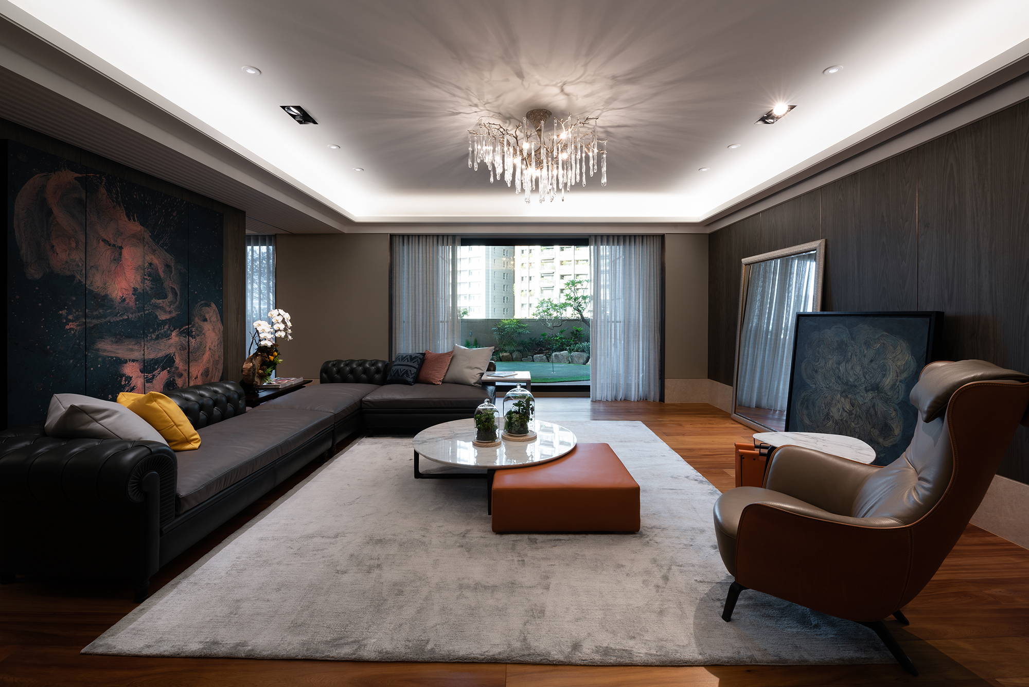 The stone and titanium-plated door frame decorated at the entryway manifest the grand ambience. The study room adjoining the living room is decorated with the TABU veneers, where the dark gray, as well as a bit green, is progressively embellished from the indoor space to the outdoor terrace, both of which the colors are congruous to the furniture as well. The parlor and bedroom ornamented with the lacquers, paints and steel pieces display the composed and elegant textures.