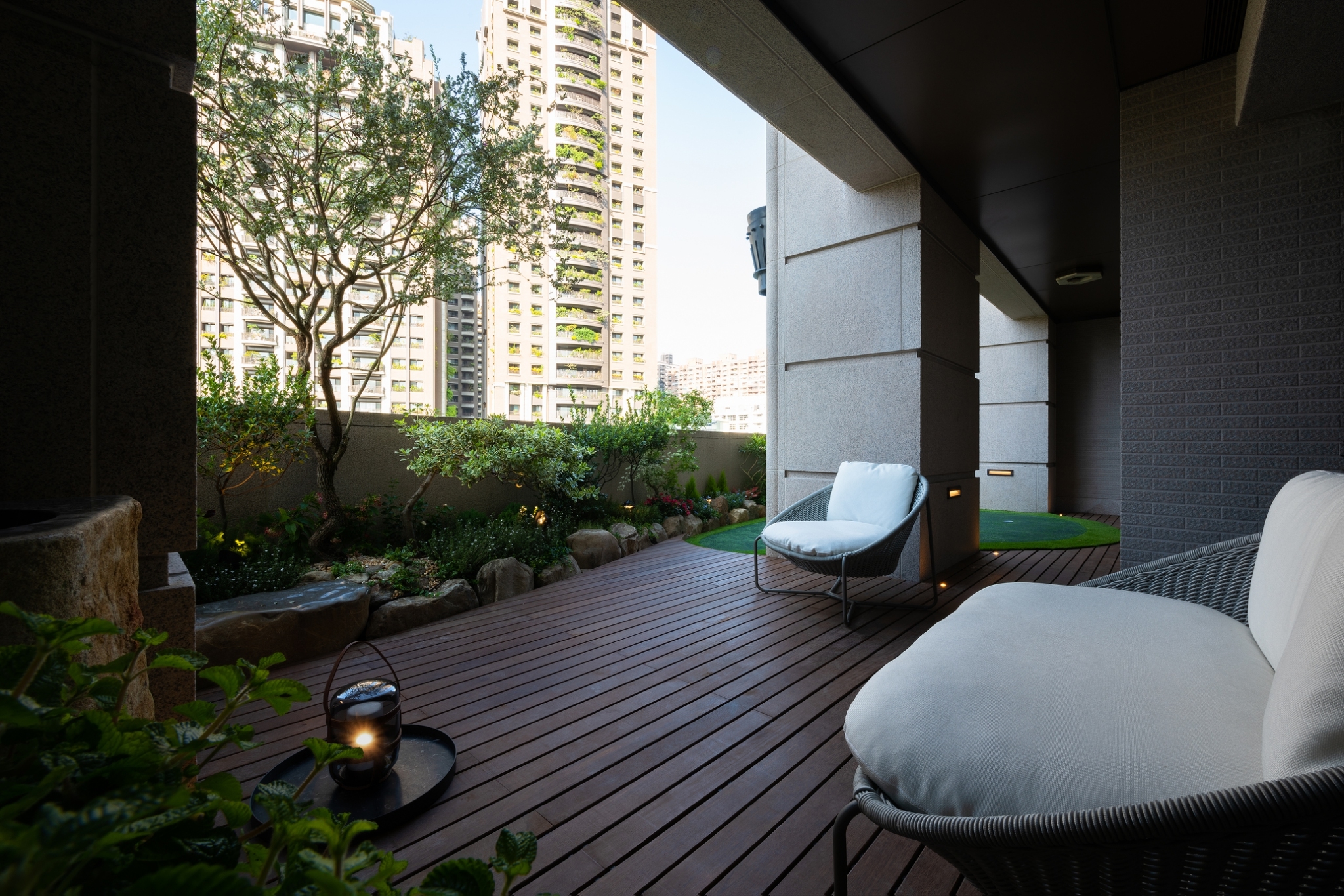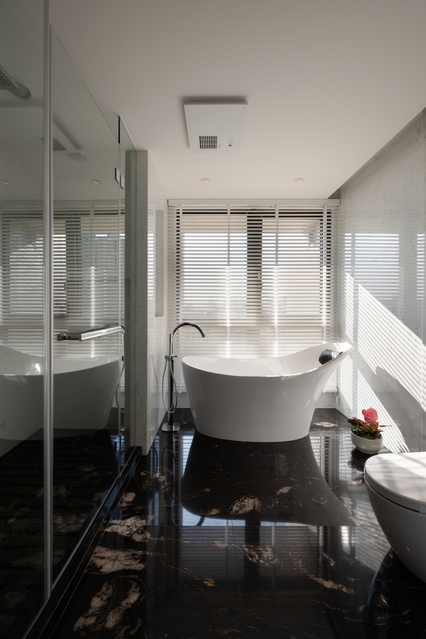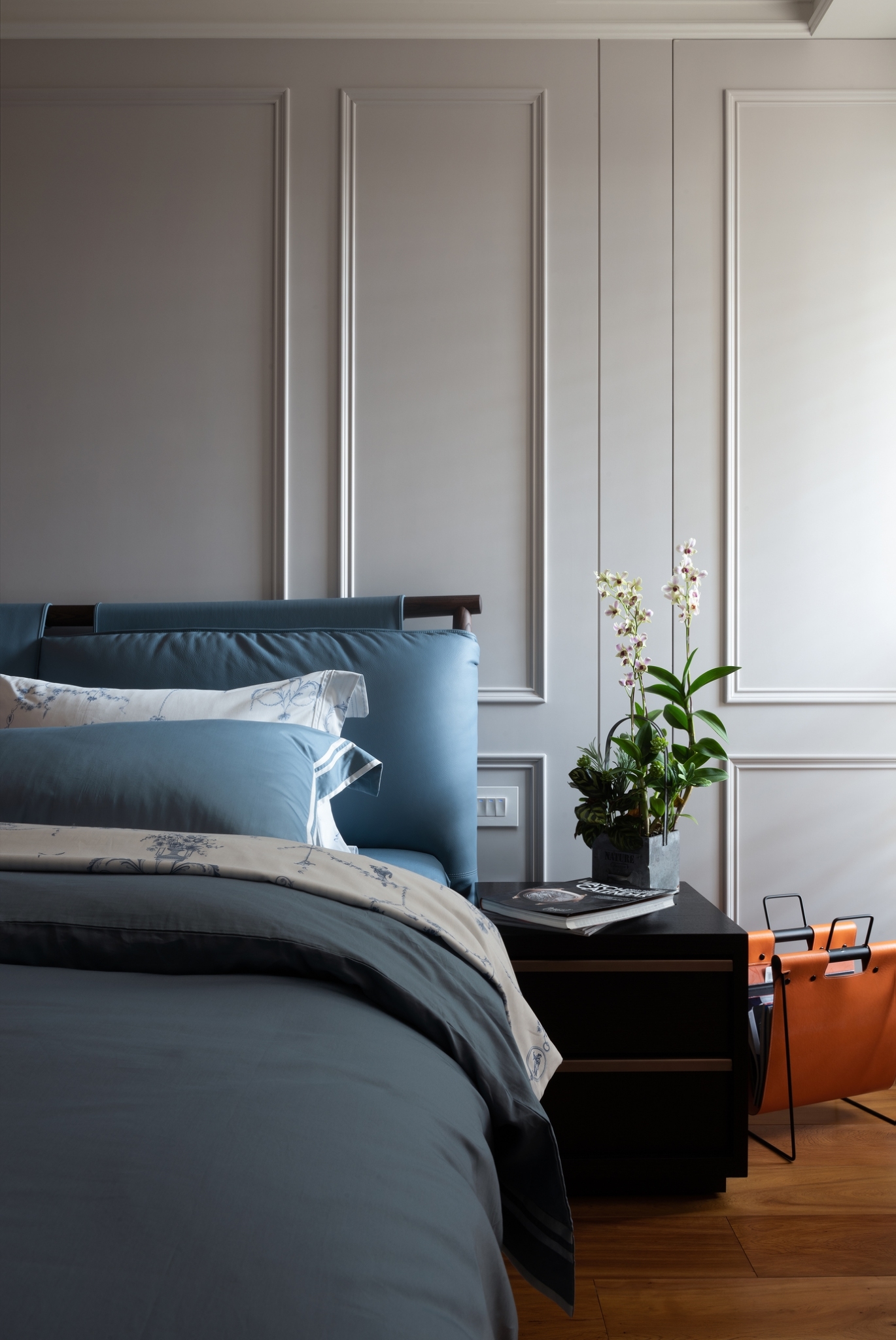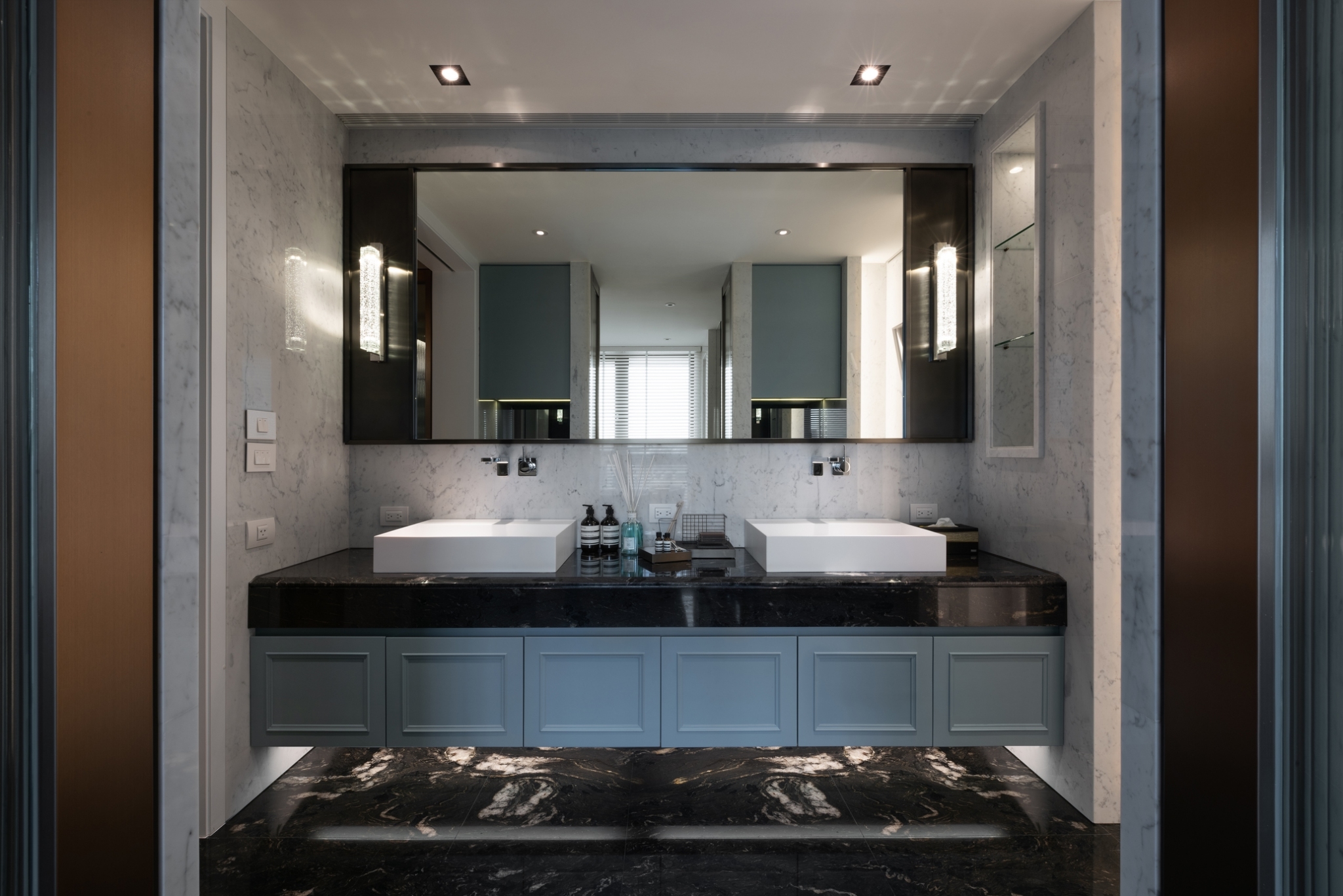 The stone and titanium-plated door frame decorated at the entryway manifest the grand ambience. The study room adjoining the living room is decorated with the TABU veneers, where the dark gray, as well as a bit green, is progressively embellished from the indoor space to the outdoor terrace, both of which the colors are congruous to the furniture as well. The parlor and bedroom ornamented with the lacquers, paints and steel pieces display the composed and elegant textures.