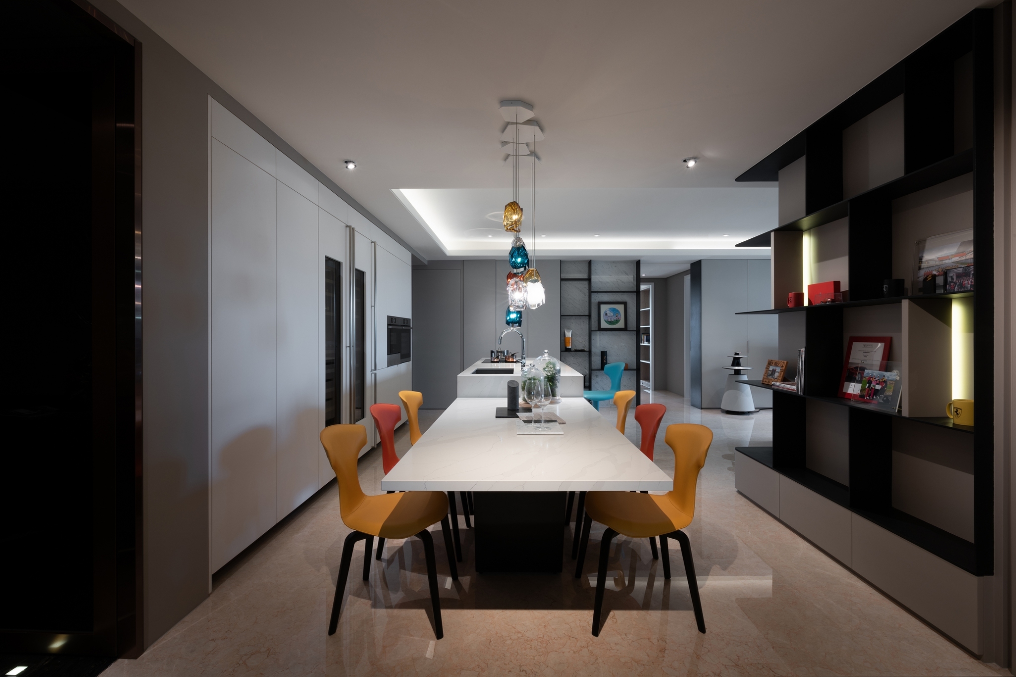 The L-shaped layout in this house is dissimilar to the general layouts in houses. This residential interior design project built the dual traffic flows at the entryway, the arrangement not only relocating the bathroom, also connecting the dual traffic flows individually to the public and the private areas. One of the dual traffic flows can bring people to the living room; the other to the bedrooms, dining room, and kitchen. This design idea not only shortens the traffic flows, also establishes the transitions of the circle scenes in the house.