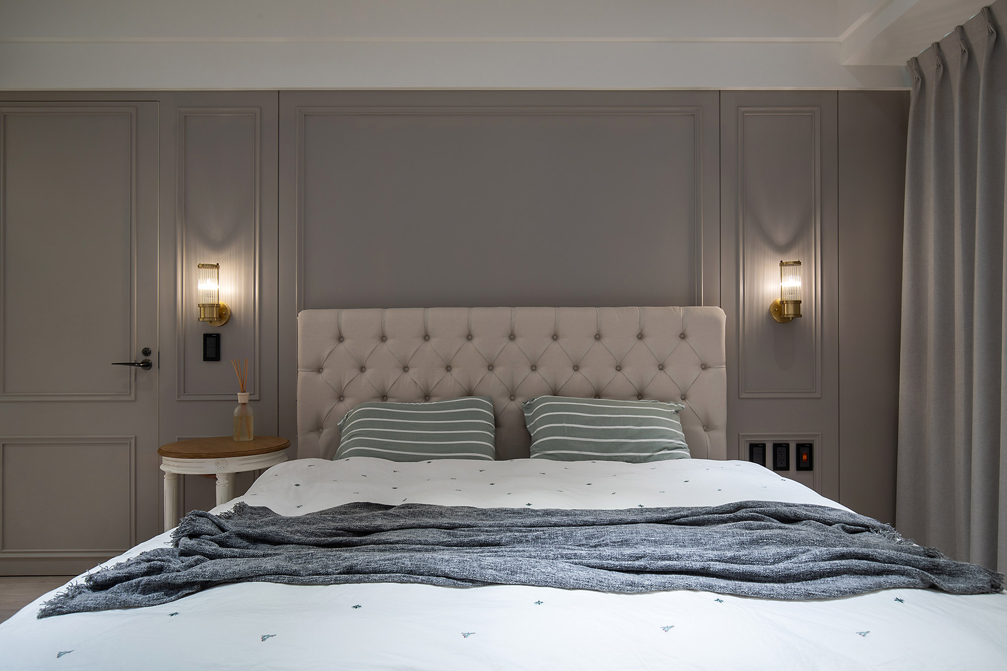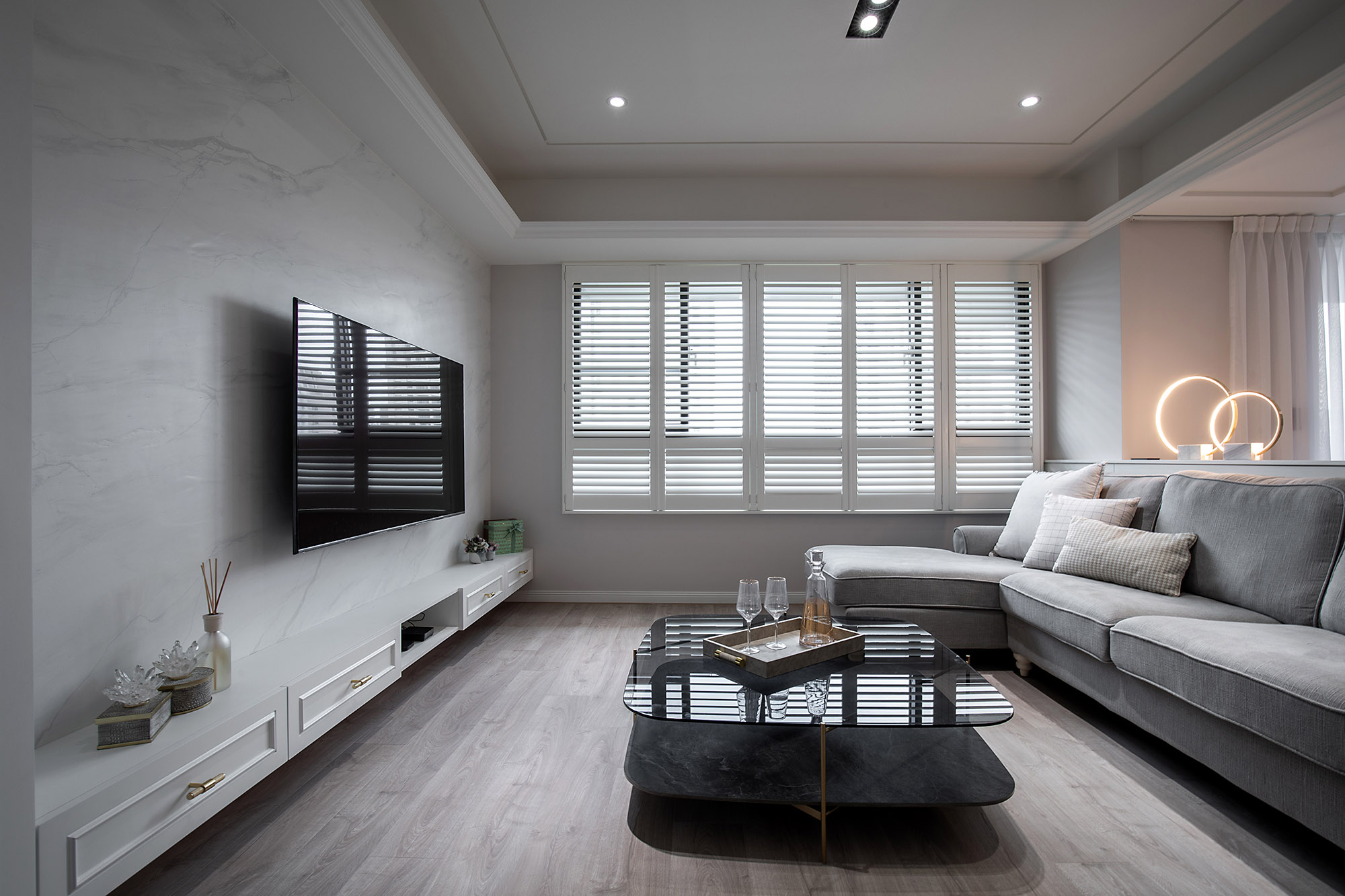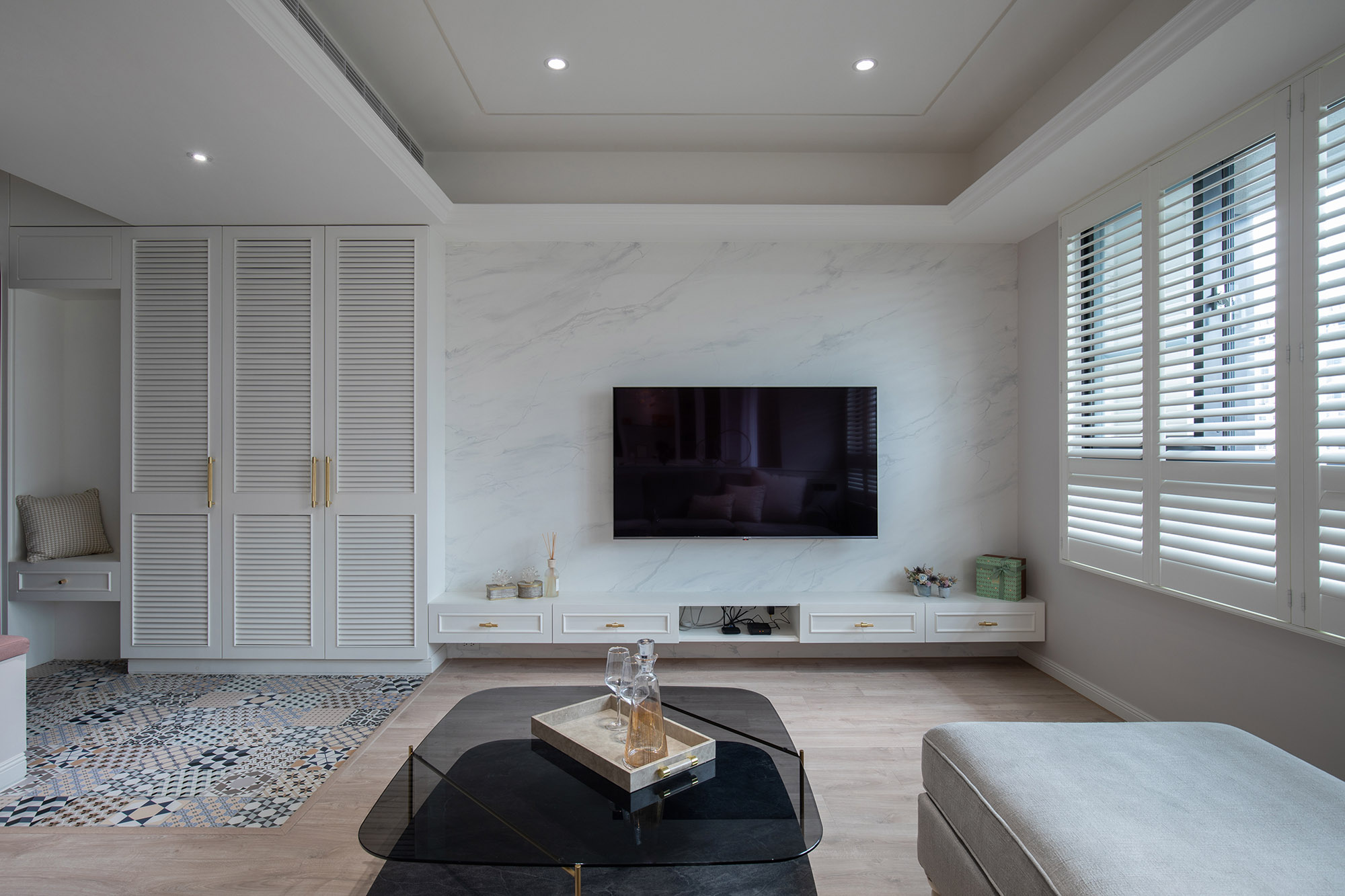 It is admirable that the designer was very diligent in planning the details of design project. The adhesives normally overlooked by most architects were strictly examined by the designer, who specifically demanded that the wood veneers and their adhesives be low formaldehyde. The eco-friendly latex paints, including the special mineral paint for the TV wall, can decompose formaldehyde. Formaldehyde, which is regularly contained in paints for 9 months, can be completely decomposed in a month. The eco-friendly paints are safe, attractive, healthy, and eco-friendly.
