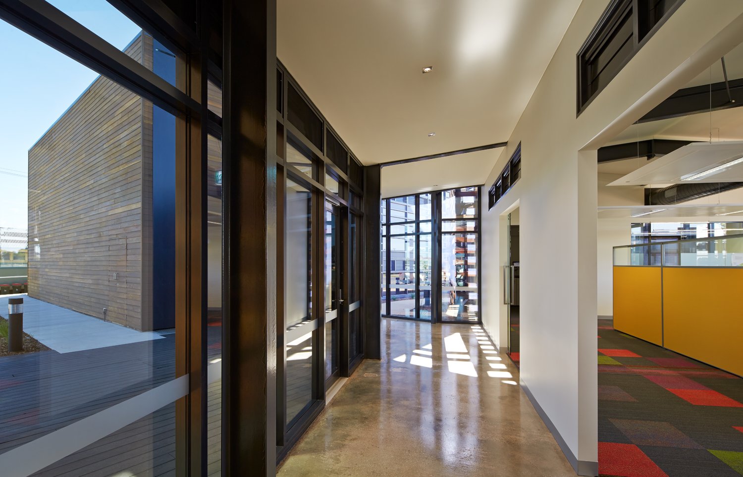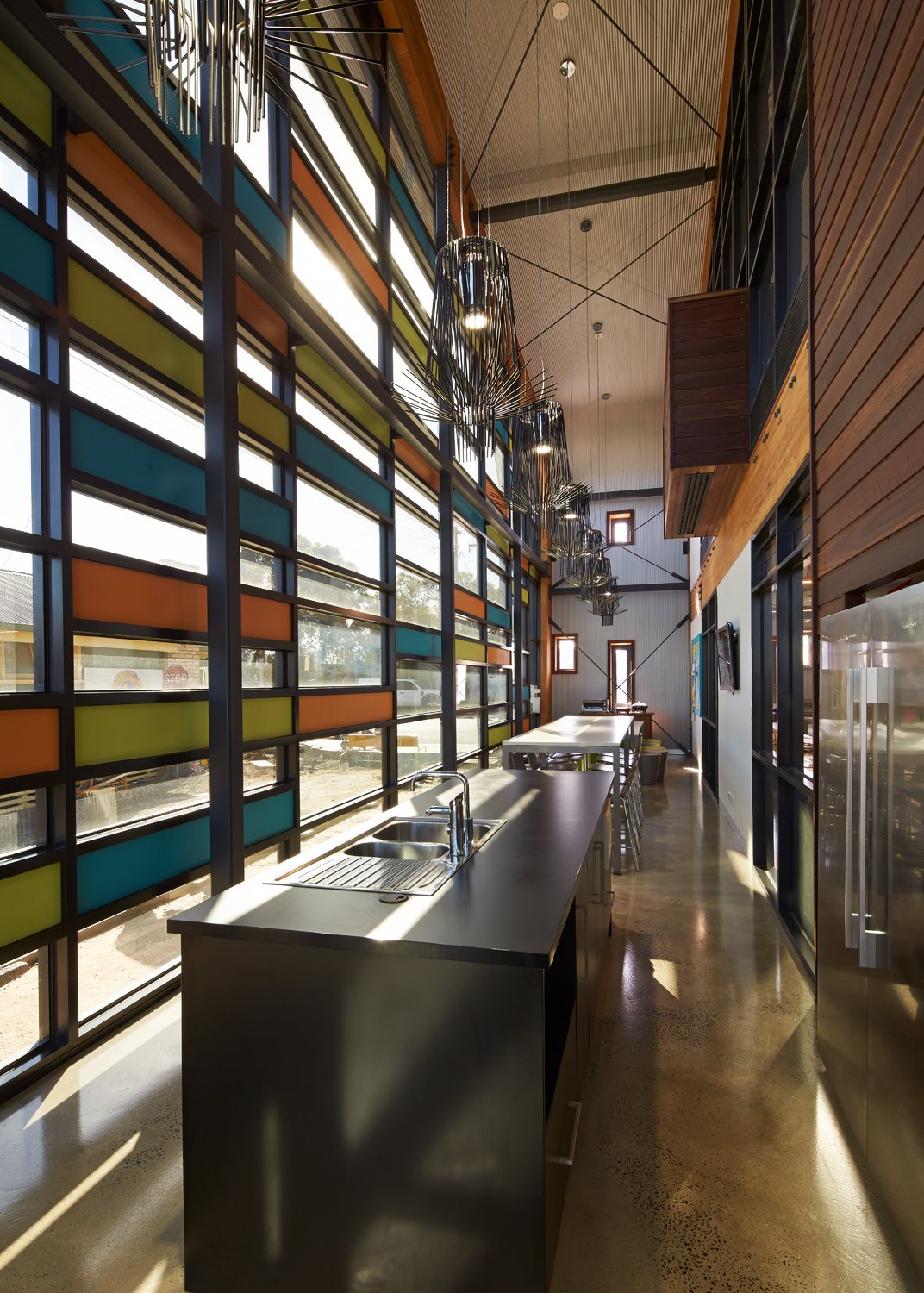 Conscious of the building’s location in a region which is exposed to extreme temperature conditions, k20 Architecture paid much attention to the building’s thermal performance. By constructing a series of thermal chambers underground via earth tubes and under-floor ventilation plenums, fresh air is drawn in from the exterior and cooled (or warmed) naturally by the earth before being redistributed back throughout the building via plenums and air displacement floor grilles. The Hindmarsh approach pre-tempers the air via an earth pipe heat exchange system before it is introduced into the habitable areas of the building, thus greatly reducing the energy required to heat or cool the air once inside the space. Other sustainable features include LED lighting systems throughout; solar panels; recycling of over 80 per cent of the existing building’s materials; sustainably sourced laminated timber beams; zoned mechanical system; passive solar design, cross-flow ventilation and zoned motion-detection lighting.