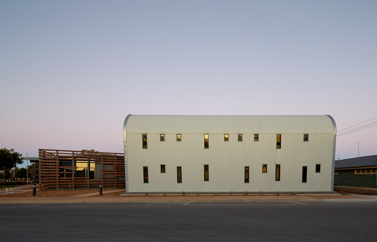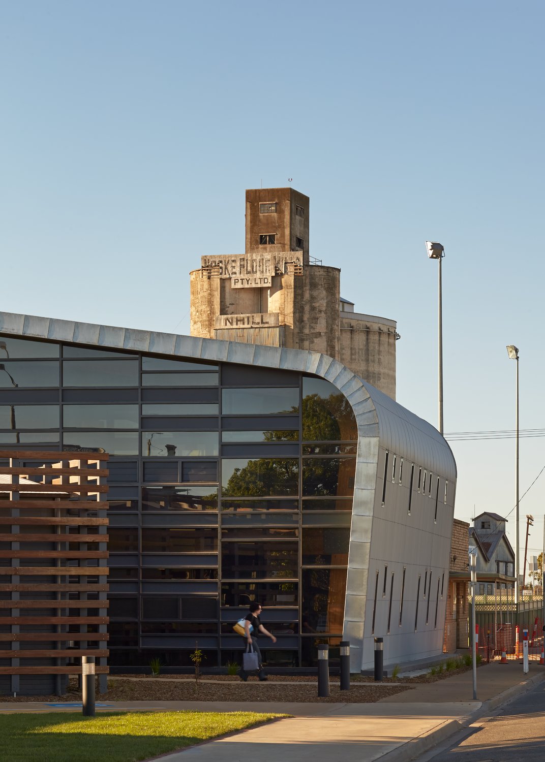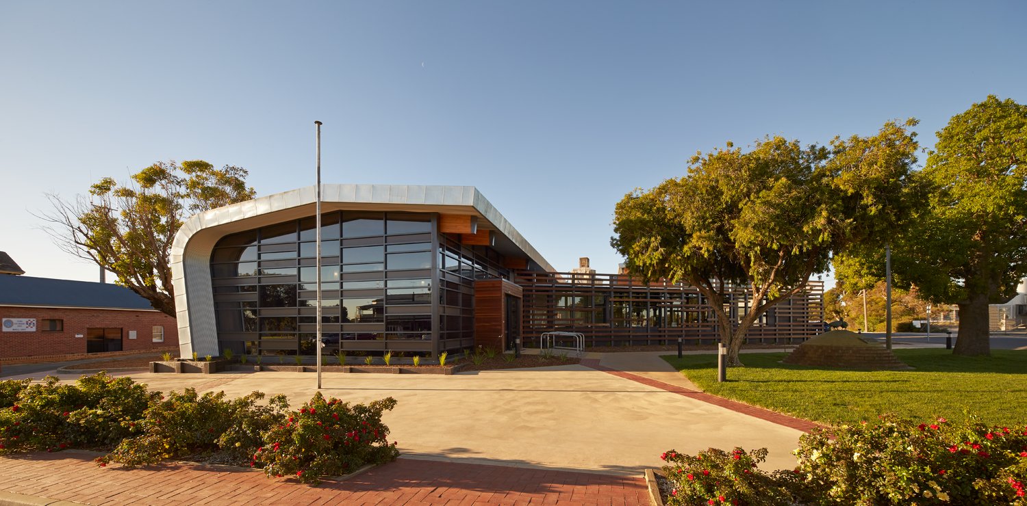 Hindmarsh Shire Council Offices is a technologically advanced, sustainably focused new Civic and Administration Centre located in the rural setting of Nhill, Victoria. The precinct re-uses the existing 1960’s building and encapsulates it within its new contemporary built form. Although double the size of the building it replaces, the facility uses 60 per cent less electricity. The building was inspired by the town’s identity as a hub of wheat production with steel storage silos and agricultural sheds dotting the landscape. The new centre’s form and restrained material palette of timber, steel and glass gives subtle references to the local agricultural context; utilising the craftsmanship of the folded metal inherent in the silos in the form of locally sourced steel and zinc finishes along the building’s exterior.