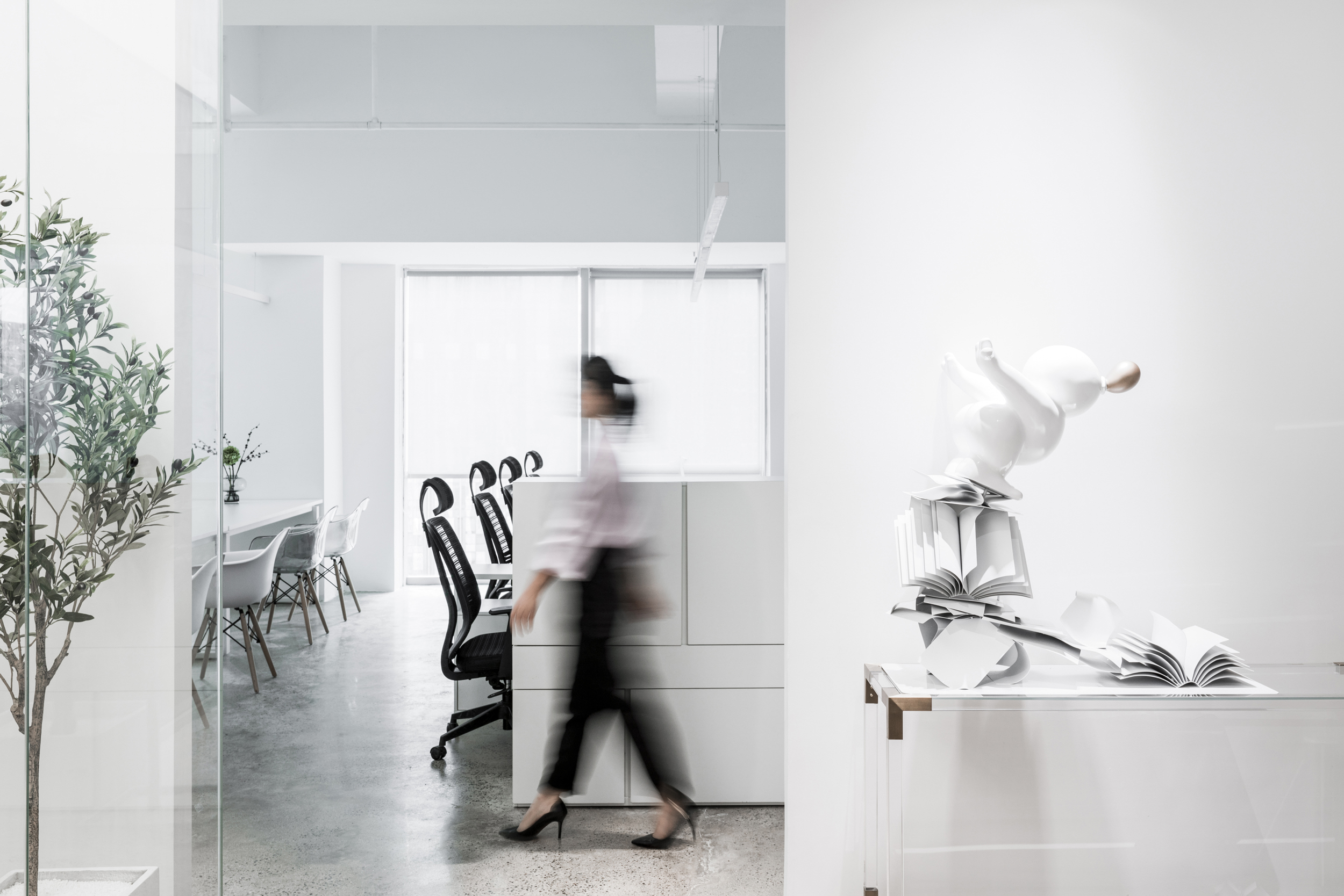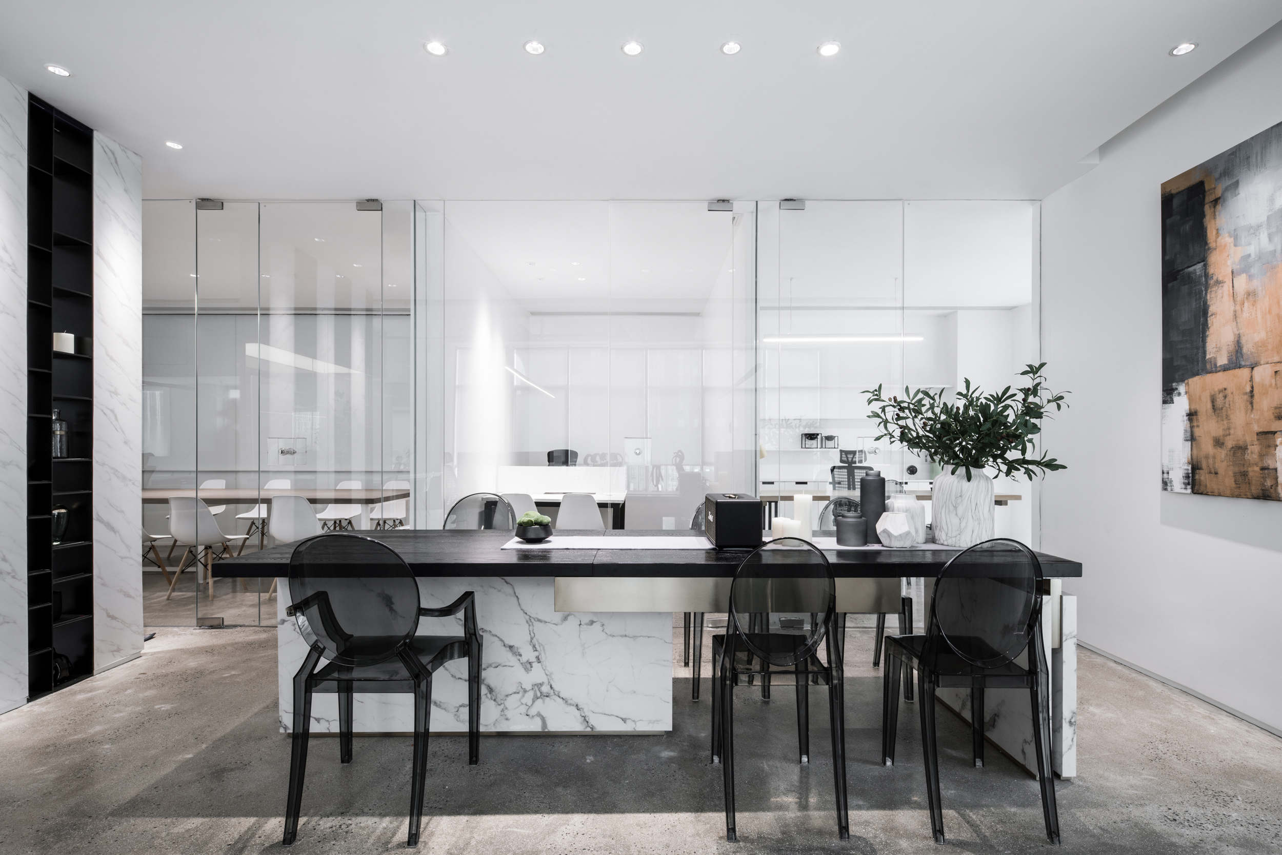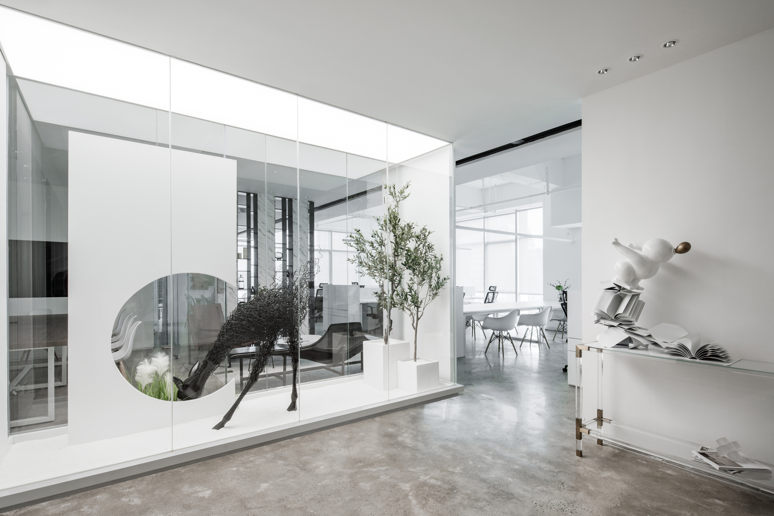 The warm and simple stone reception desk adds a sense of hierarchy to the overall quiet white tone, and the ritual line cuts express the artistic conception of oriental aesthetics. The designer pays great attention to the balance of the material context, craftsmanship and contemporary aesthetics in the space, and releases the oriental charm in the modern texture design, and uses the moisturizing and silent design techniques to link the contemporary and traditional humanistic office methods. Between the coldness of marble and metal, the plain terrazzo and 4000K soft lighting bring out a warm white atmosphere, which outlines an orderly and mysterious spatial hierarchy. In the right spatial texture, the eternal gentleman's elegance is permeated. The designer transforms the poetic into the design, in the low-key and quiet tone of the space, portrays the upward-growing branches, polishes the context and artistic style of the space in the details, and creates the interest of life. The luster of metal and the texture of stone are in dialogue with each other. They are distinct and reflect each other. The relaxation of natural materials and the rational restraint of modern materials are highly blended together, deducing a balanced aesthetic art of "respectively wonderful and mutually linked".