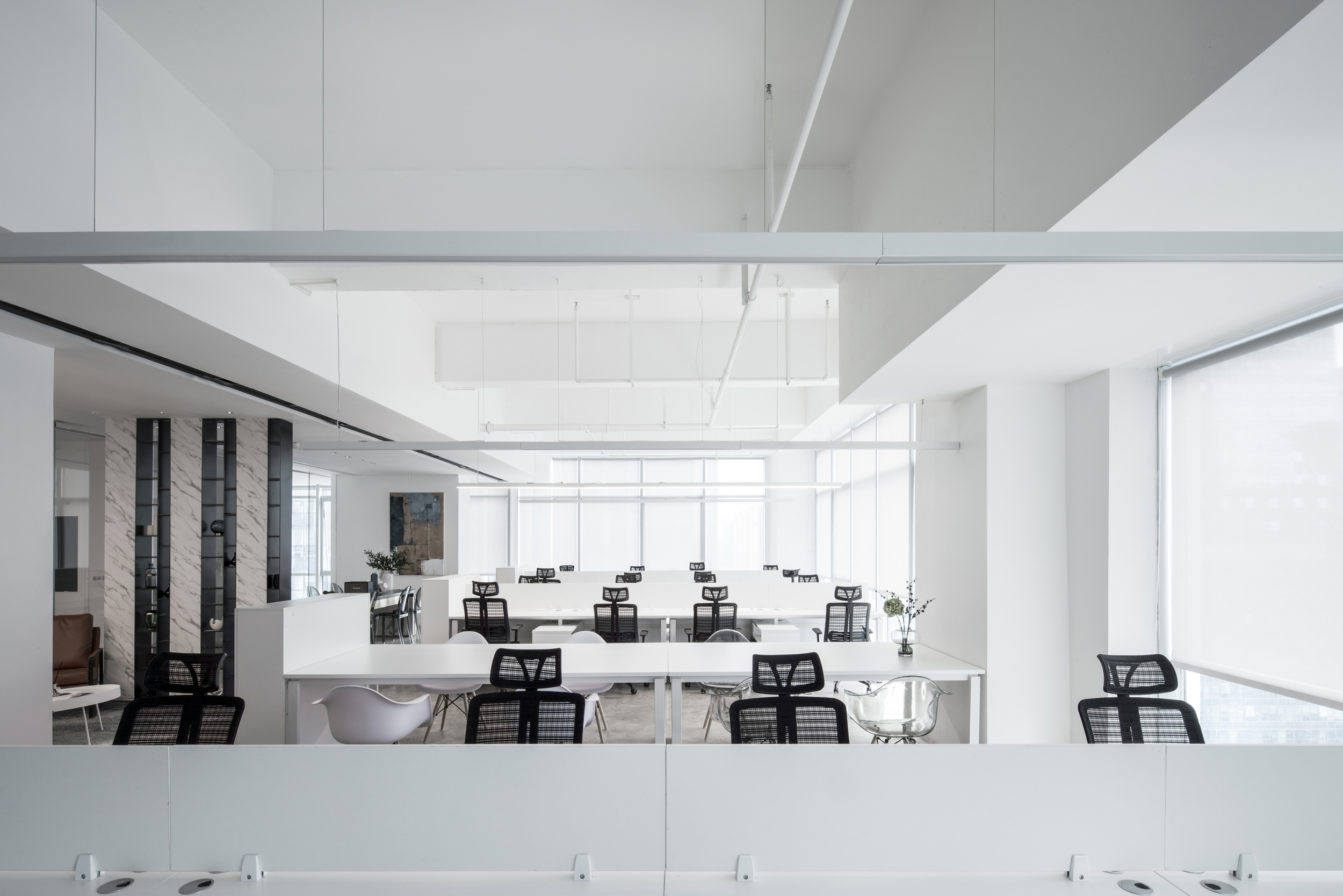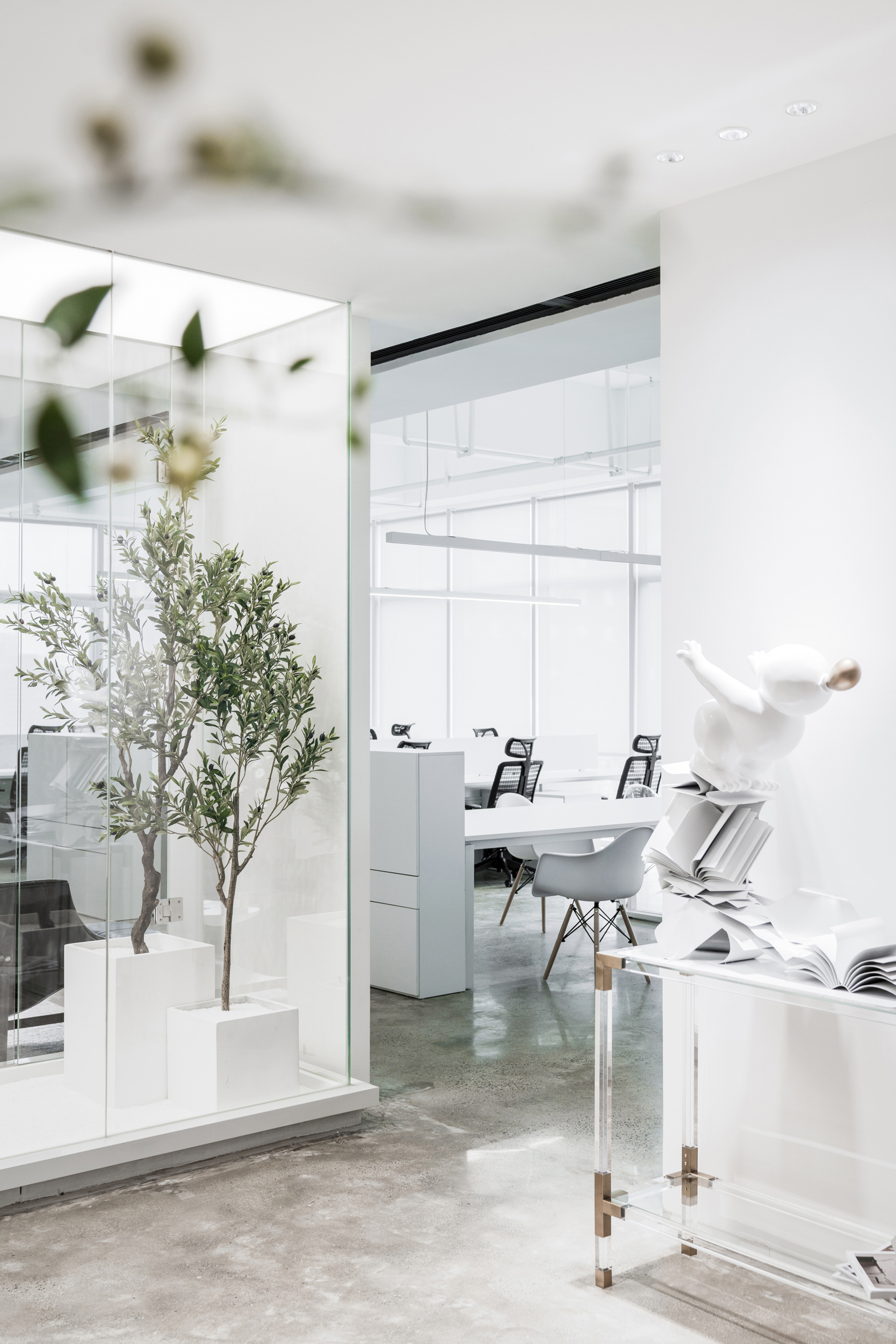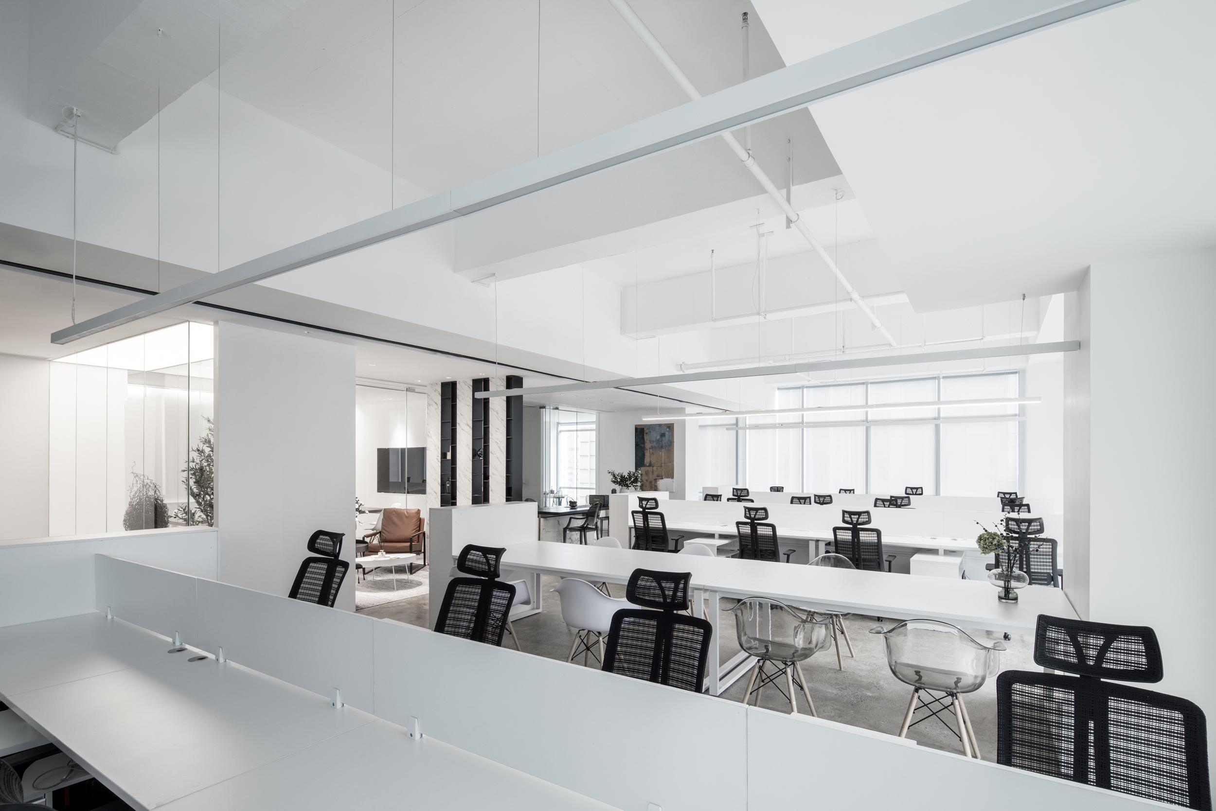 The use of pure white space strengthens the relationship and atmosphere of the space, and at the same time makes the indoor plants lush and peaceful. The glass partition that can be opened and closed provides privacy and flexibility for the meeting room. Relatively private independent offices, there are also some relatively closed multi-functional small rooms that double as model room material rooms, and at the same time can provide employees with a quiet and focused work environment. The white space is conducive to the focus of work, and the office on the second floor provides a wide integrated workbench for designers. The customized shared desktop facilitates the transition from single-person work to teamwork. Various lines are hidden inside the table. Work storage units are distributed along the side walls of the office, large enough to hold everyone's belongings.