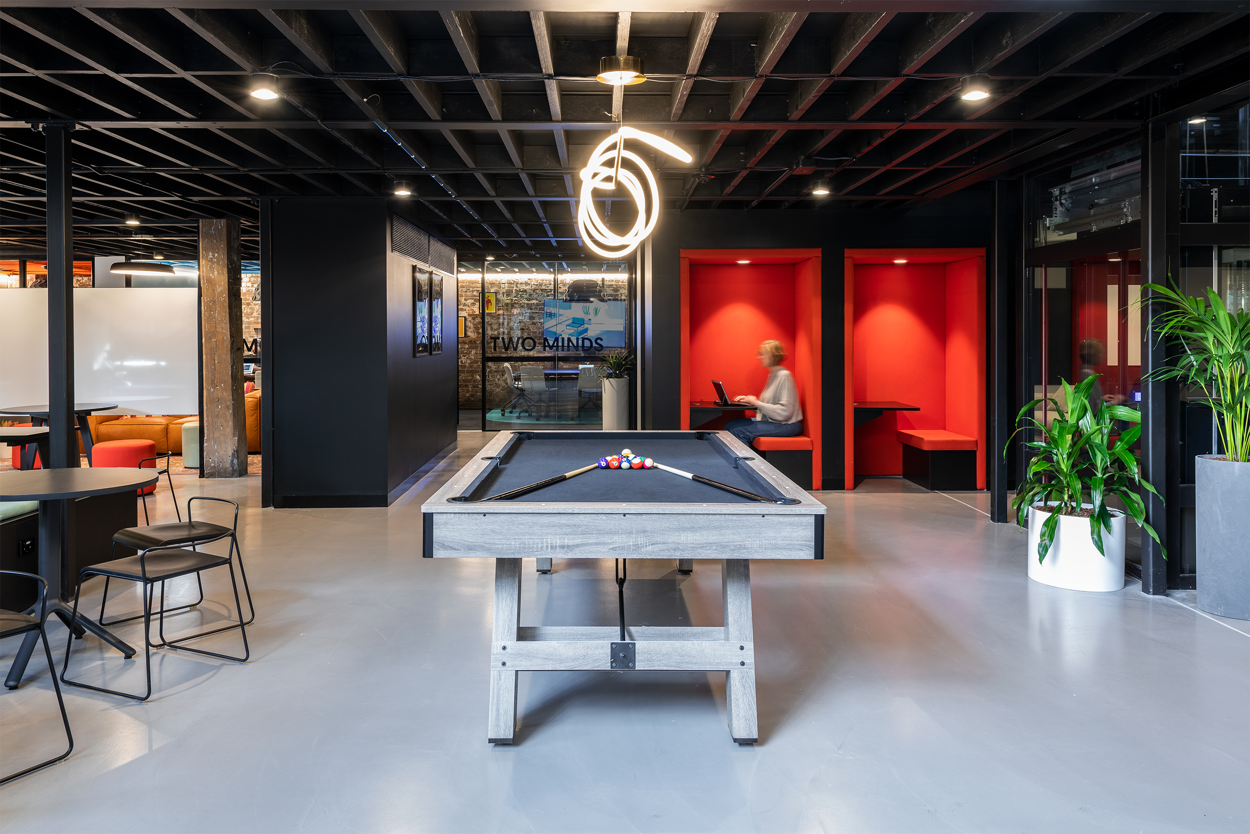 As a growing creative agency with a purpose to ‘Build Brands for the Experience Era’, Akcelo had a strong vision and needed a creative team to bring their own brand experience to life. The brief was unique as it required a flexible yet relaxing workplace during the day, and a bar-style event space in the evening, for not only their staff but also clients. Cachet’s response was to create a design that had an essence of a co-working environment. This was a focus for the ground-floor with highlights of this concept showcased through the; eight-metre long island bar, pops of colour, stunning vertical timber wave at the entry, wrap-around client lounge zone and unique light features to emphasize the base build features. The ground floor was divided into two zones; the event space connecting to the boardroom and the ‘dark side’ under the mezzanine. The dark side hosts a suite of digital meeting rooms, work booths, collaboration tables and banquettes. A noteworthy space is the sound recording room and interconnected edit-suite, arming Akcelo with a state-of-the-art facility, inhouse. A signature pool table and tiered seating positioned under stairs connects these two zones. Upstairs, Cachet designed the ‘Engine Room’. With a range of flexible desking to accommodate a growing workforce; the mezzanine is dedicated to focused work. The Akcelo office is designed as an agile environment with a mix of spaces to encourage staff to move around the space and work where they feel most creative.