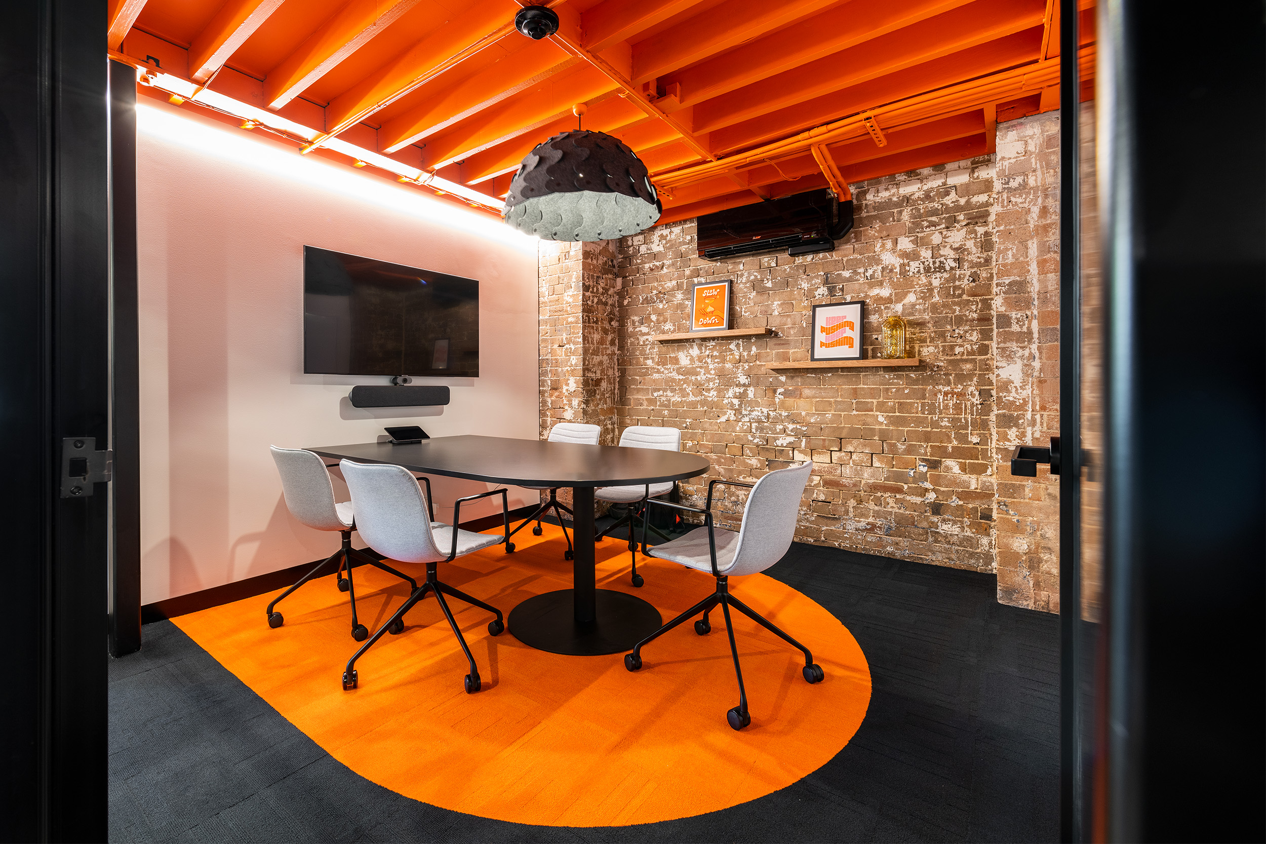 Co-creation is at the heart of creating our personalised designs and ideally this occurs in a live environment, where our client and designers work together to conceptualise ideas as one team. The concept stages of the project were hugely disrupted by the multiple Covid lockdowns in Sydney. However, Cachet Group implemented the use of a digital platform to help visualise concepts with Akcelo. All interviews, envisioning sessions and creative workshops were completed through a live interactive digital whiteboard, accessible by Akcelo and Cachet Group 24/7 enabling limitless creativity. This enabled Akcelo to engage, co-create and produce an outcome that was true to their brand. An architectural challenge in this project was the low ceiling of the area under the mezzanine which harboured limited light. This gave way to the concept of the ‘dark side’ where Cachet’s design team introduced creative solutions to brighten the area. This included incorporating curl lights and strong pops of colour in the meeting rooms and single-person booths which echo the Akcelo red and catch your eye as a wayfinding element within the space. Additionally, the double height space, skylights and saw-tooth roof of the existing warehouse proved a challenge to illuminate for a commercial environment. However, the design team cleverly combined wall washing lights, LED strip lighting and curly feature lights with other industrial style lighting elements to produce a natural and comfortable environment.
