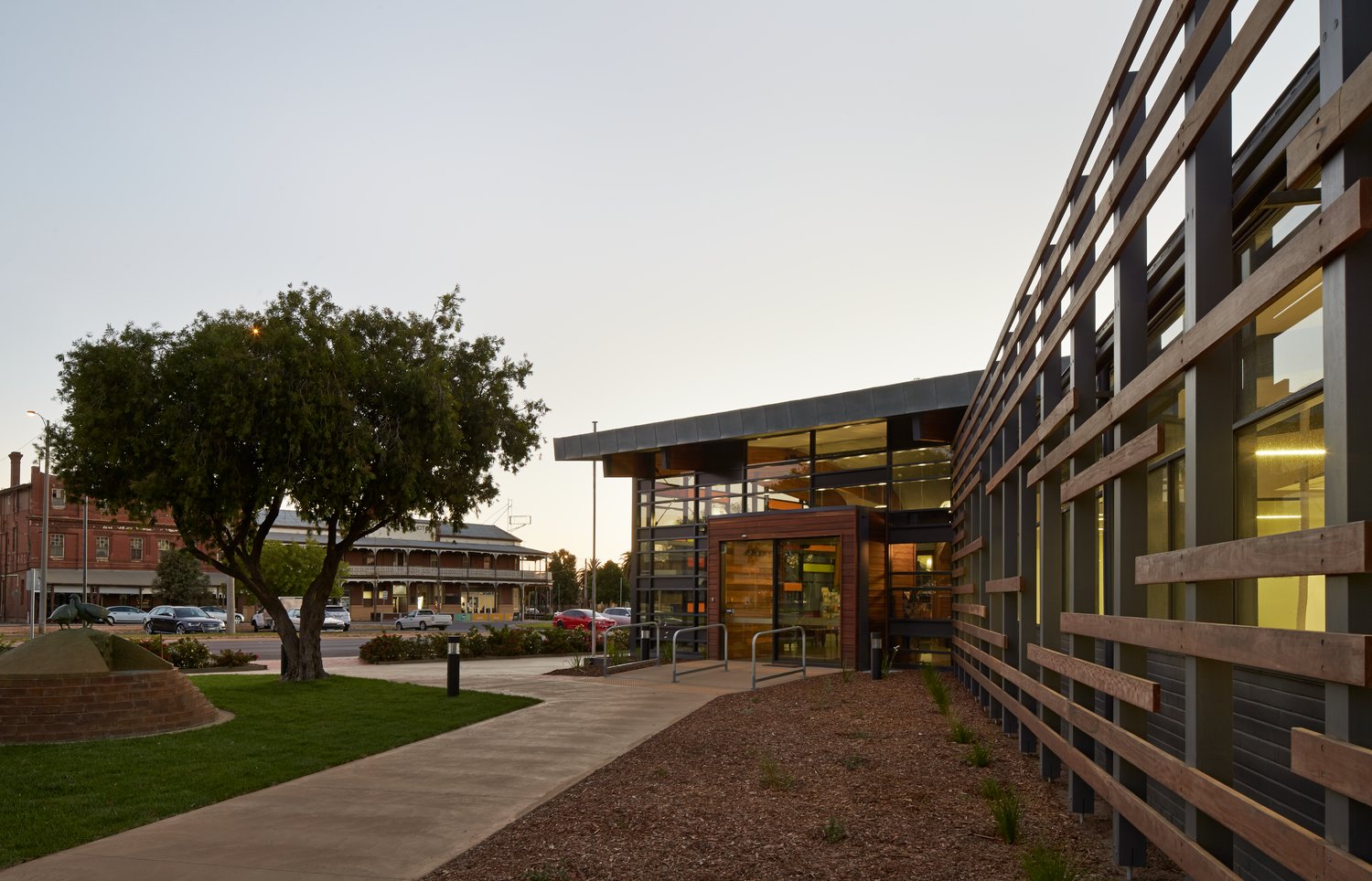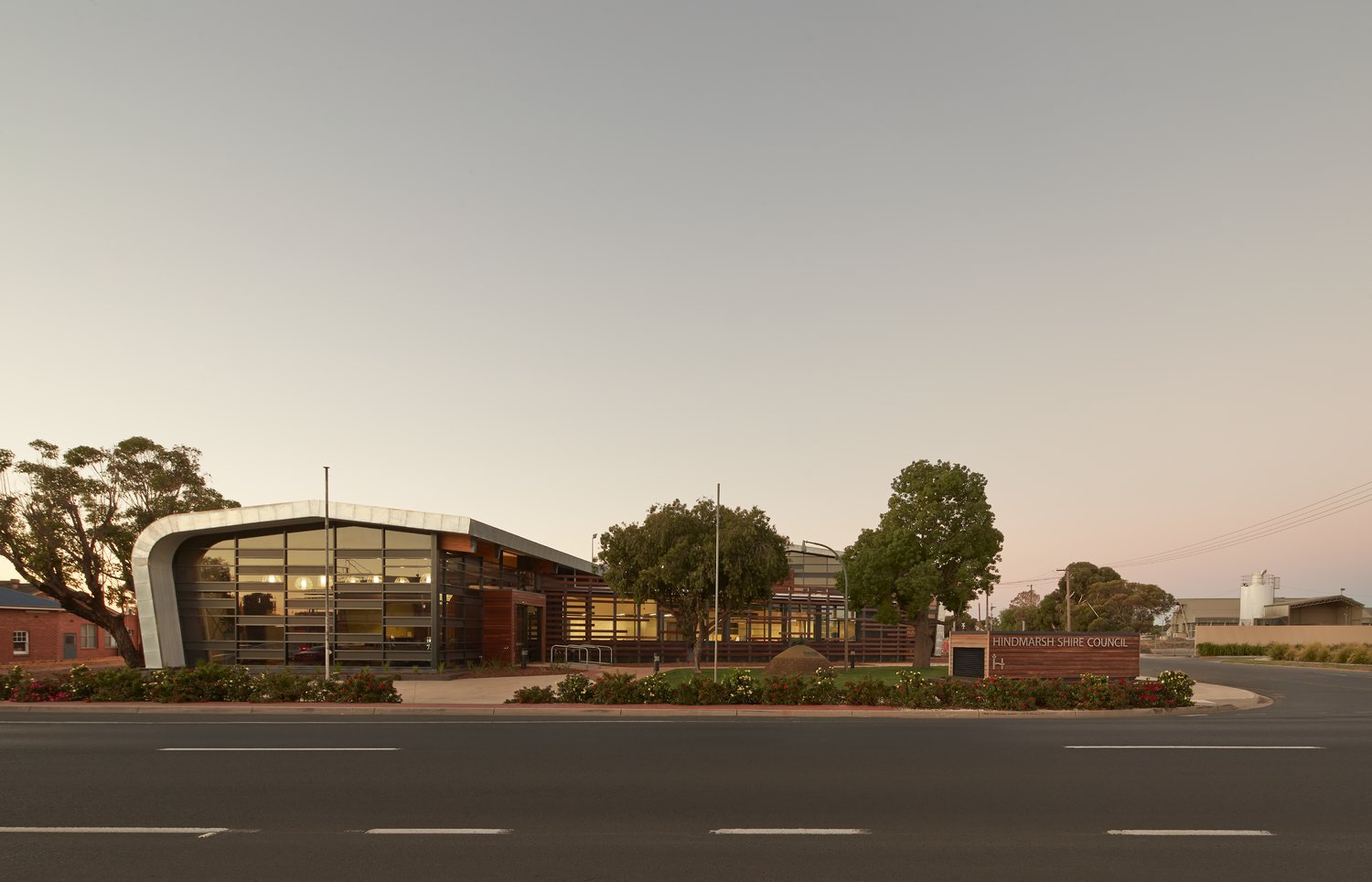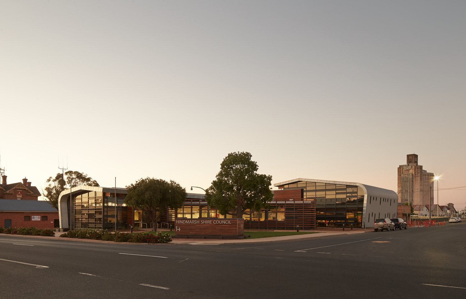 Hindmarsh Shire Council Offices is a technologically advanced, sustainably focused new Civic and Administration Centre located in the rural setting of Nhill, Victoria. The precinct re-uses the existing 1960’s building and encapsulates it within its new contemporary built form. Although double the size of the building it replaces, the facility uses 60 per cent less electricity.