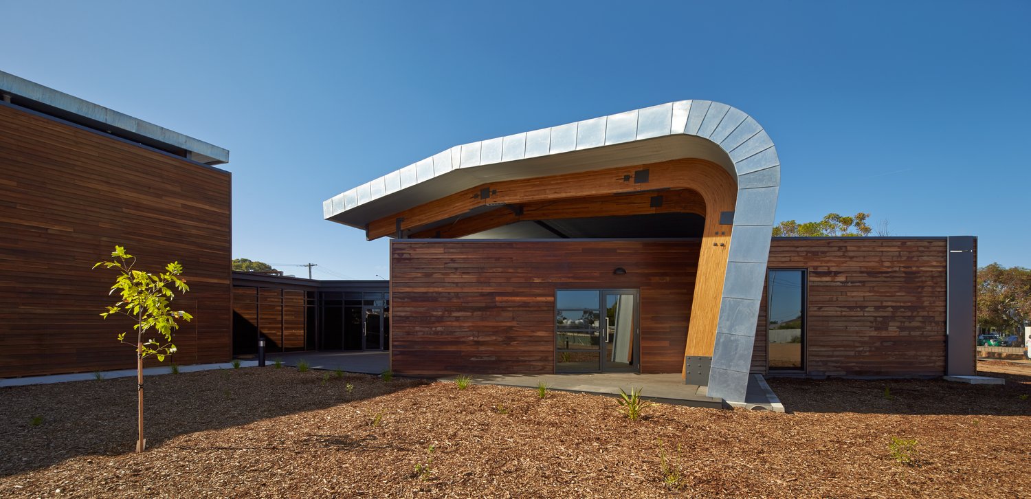 The building was inspired by the town’s identity as a hub of wheat production with steel storage silos and agricultural sheds dotting the landscape. The new centre’s form and restrained material palette of timber, steel and glass gives subtle references to the local agricultural context; utilising the craftsmanship of the folded metal inherent in the silos in the form of locally sourced steel and zinc finishes along the building’s exterior.