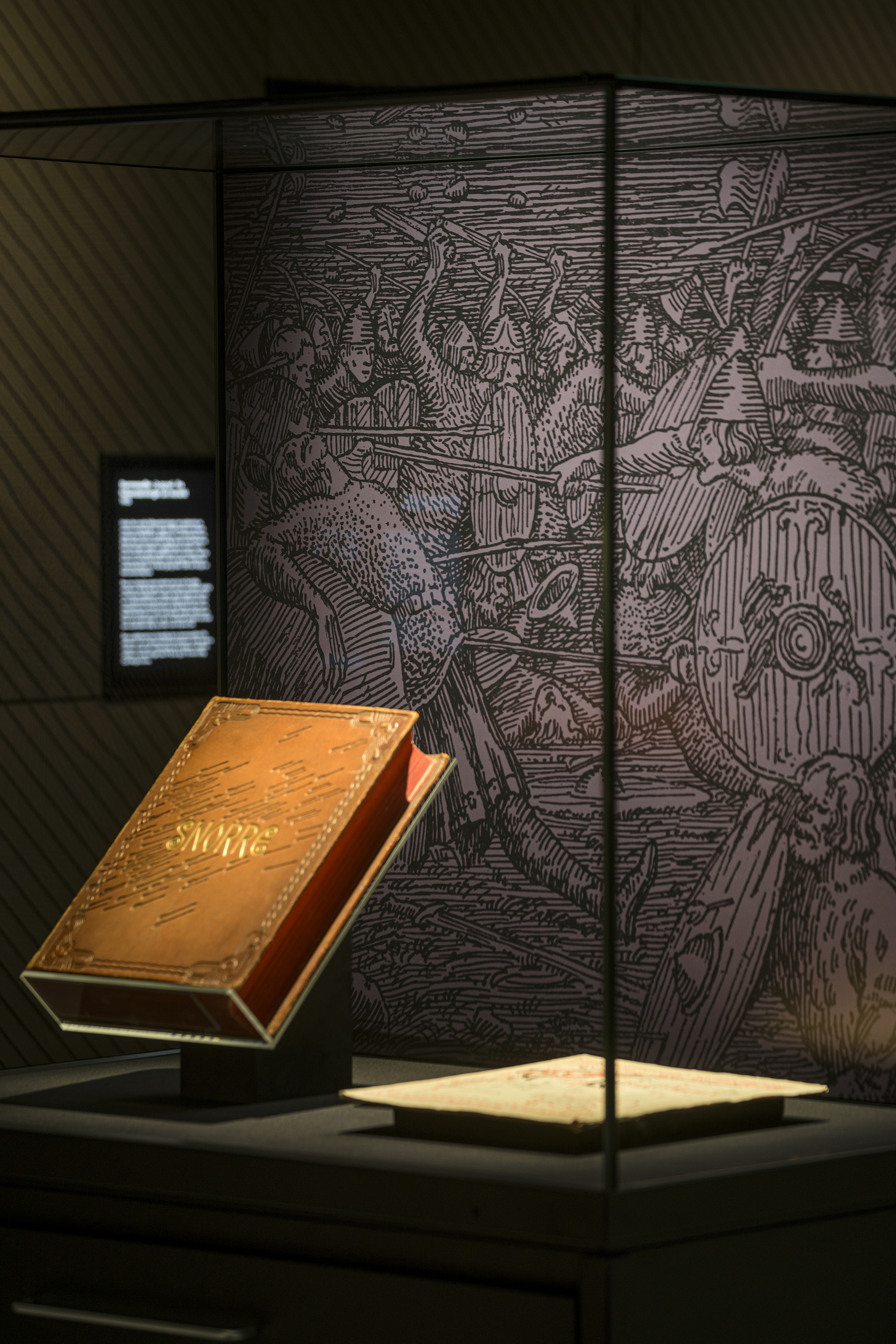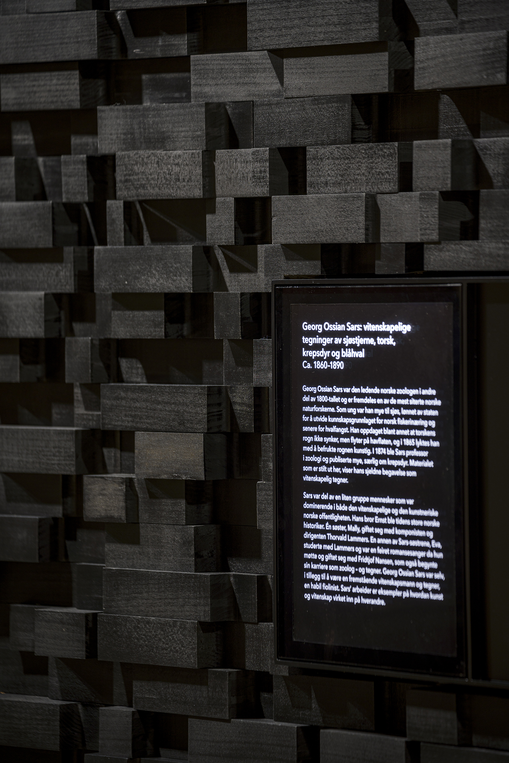 This is a permanent exhibition and so all materials were chosen to be as high-grade, natural and durable as possible. Through an extensive sampling process we carefully tested all materials and their treatments and finishes to ensure that the palette was aesthetically right but also ethically sourced and environmentally stable to suit the conservation environment. We used timber for floor and wall finishes, carefully finished with dark pigments recalling Norwegian vernacular. These timber finishes were chosen for their natural feel and breathable nature - the surfaces help regulate the environment and prevent spikes in temperature that would be harmful to the objects. Showcases are designed to be airtight, with integral conservation equipment and conservation-grade fabric linings. The cases were also designed with long term flexibility in mind - any changes to objects or their displays can be done with minimal intervention. The room is carefully controlled with limited air flow and carefully specified lighting lux levels.
