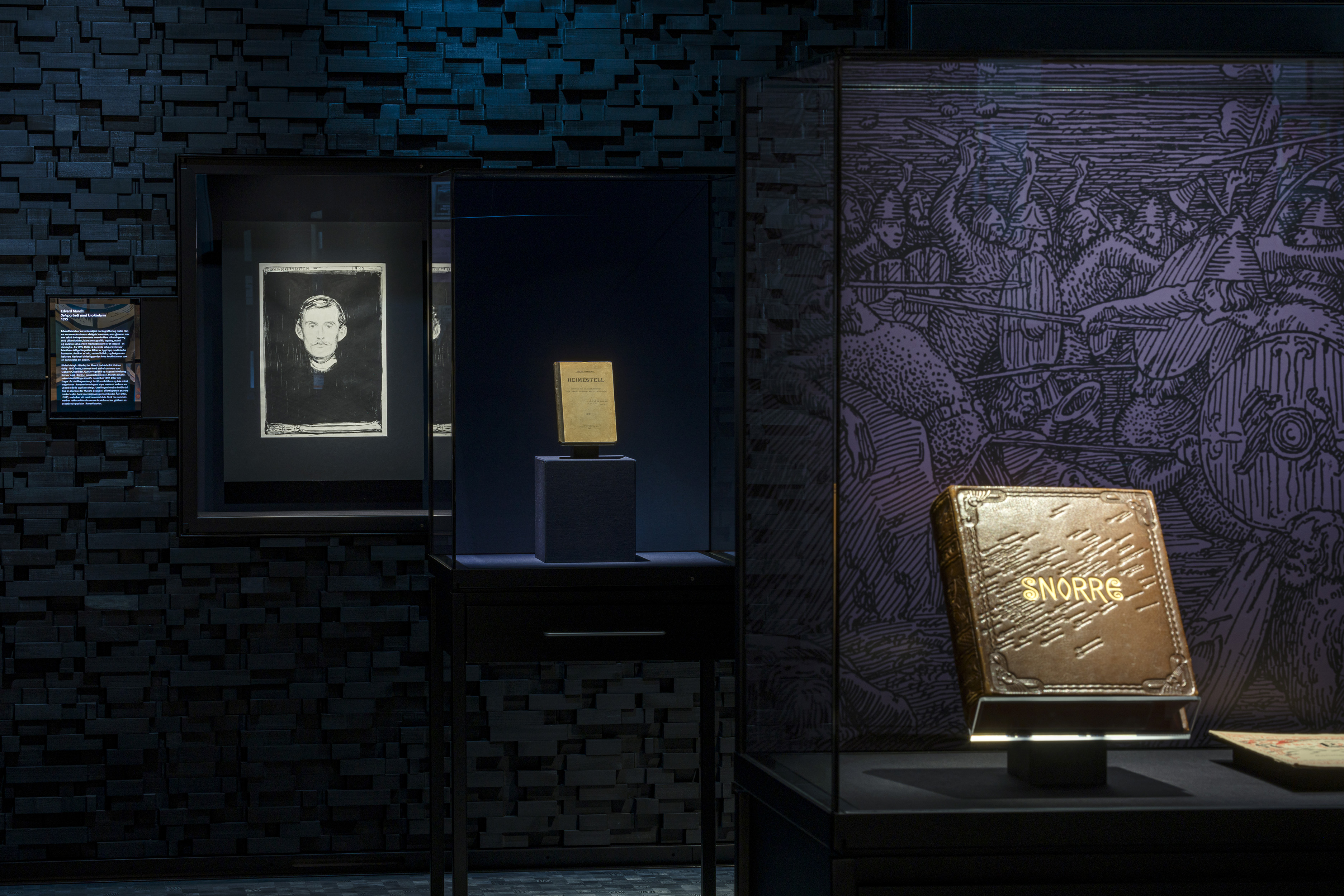 Opplyst is a new permanent exhibition, designed by Nissen Richards Studio, at The National Library of Norway (Norway’s Nasjonalbiblioteket). All branding and graphics within the exhibition are also by the London-based studio, for whom this is a second project for the same client. The first, a temporary exhibition on Norwegian book history, came to a close in January. Opplyst, meaning ‘Enlightened’, refers to the new exhibition’s central concept: the display of thirty highly-significant objects from the country’s history – fragments that helped shape the nation. The objects are now on display together for the first time in the Library’s central Oslo premises, with every surface and aspect bespoke-designed to create this dramatic and intense immersion into Norway’s fascinating history.