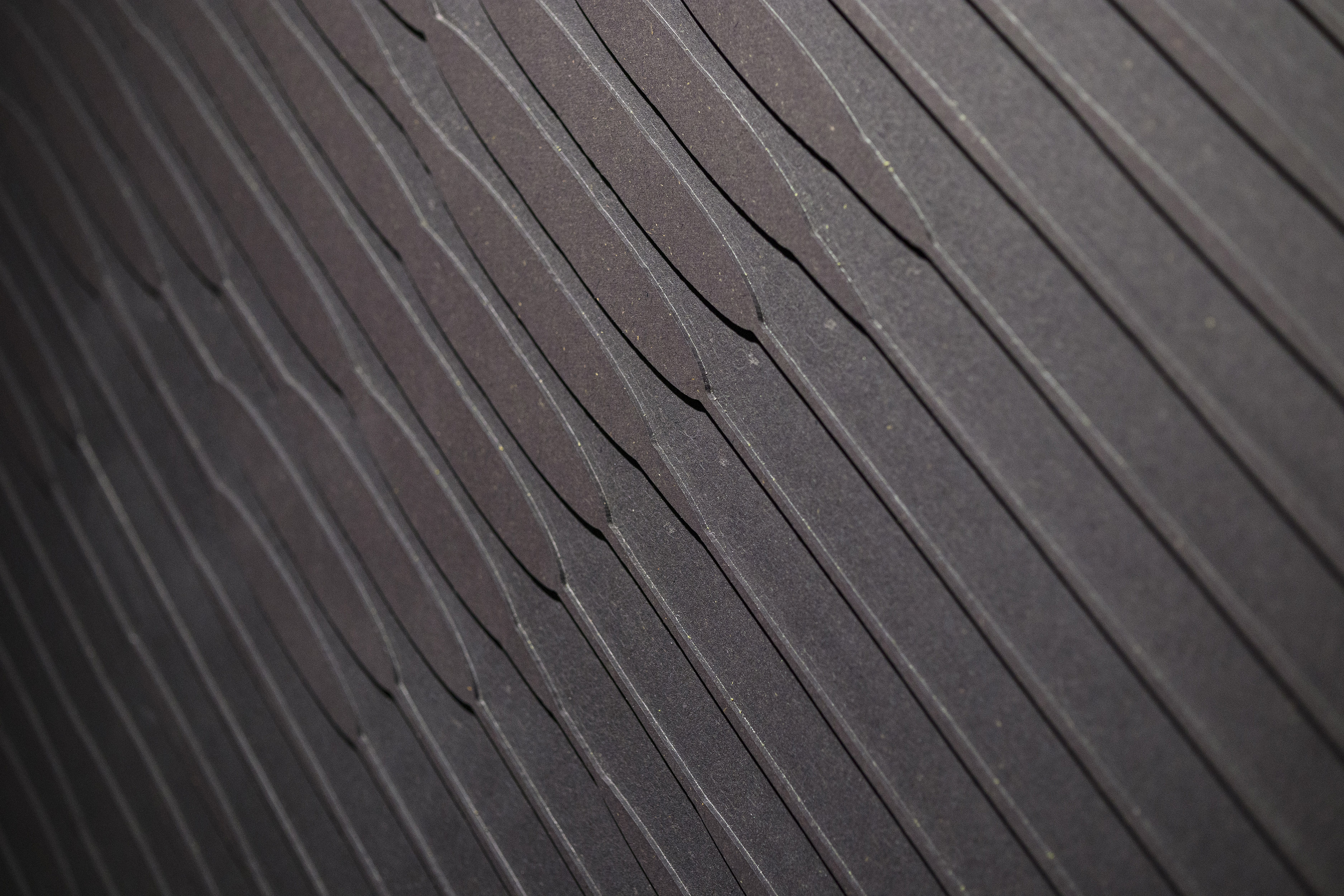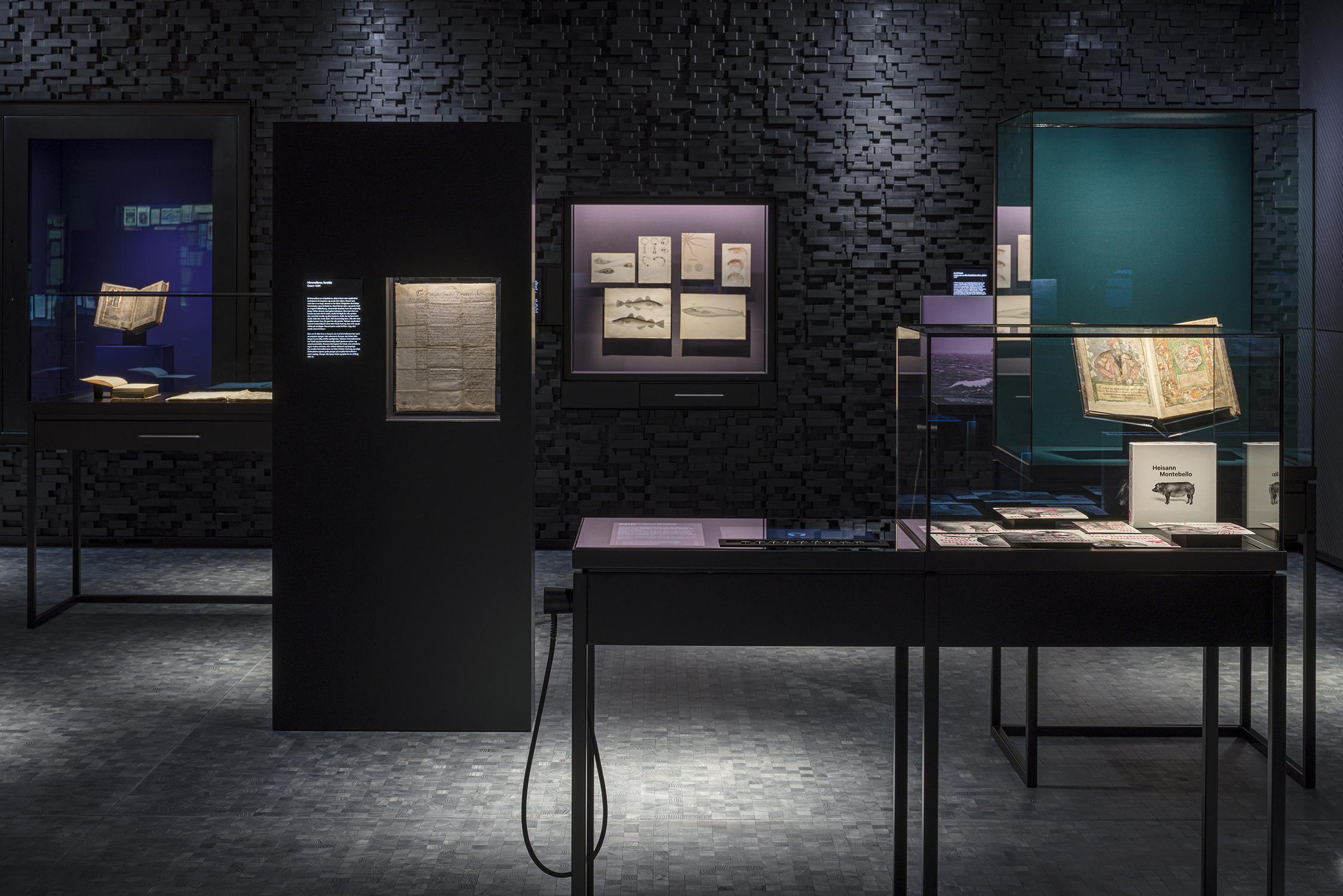 The initial concept was for the chosen objects to be floating, with the showcases rendered almost invisible. Whilst light and darkness were metaphors for the exhibition, including the concept of knowledge arising like light out of the darkness, they also became structuring devices. Nissen Richards Studio also set out to make something of lasting quality, with a materiality that spoke clearly of the ideas surrounding the project. A second source of design inspiration came from the location of the Library’s full object collection. This archive, effectively a catalogue of Norwegian culture, is stored in the belly of a mountain in the country and accessed via a fully-mechanised system, whereby a robot brings objects out on demand. Discovering more about this fascinating archive further directed the practice’s design thinking. The back wall of the new space is effectively an abstracted version of the drawers that hold the full set of historical objects, designed with timber blocks to form a surface of varying 3D depth. The idea is a room that gradually shifts over time – a darkness that the objects sit within that is an ‘active darkness’, full of content and textures.