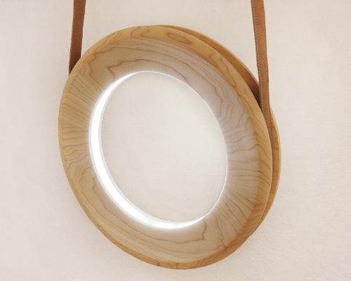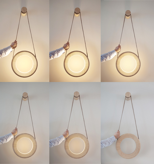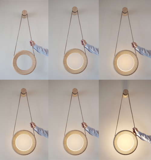 This means that in order to adjust the light the user pulls on the leather strap pulling down on the right side turns the lamp on and the amount of light emitted increases as the strap is pulled further down to reduce the amount of light and turn the lamp off the user pulls the strap on the left side of the ring.