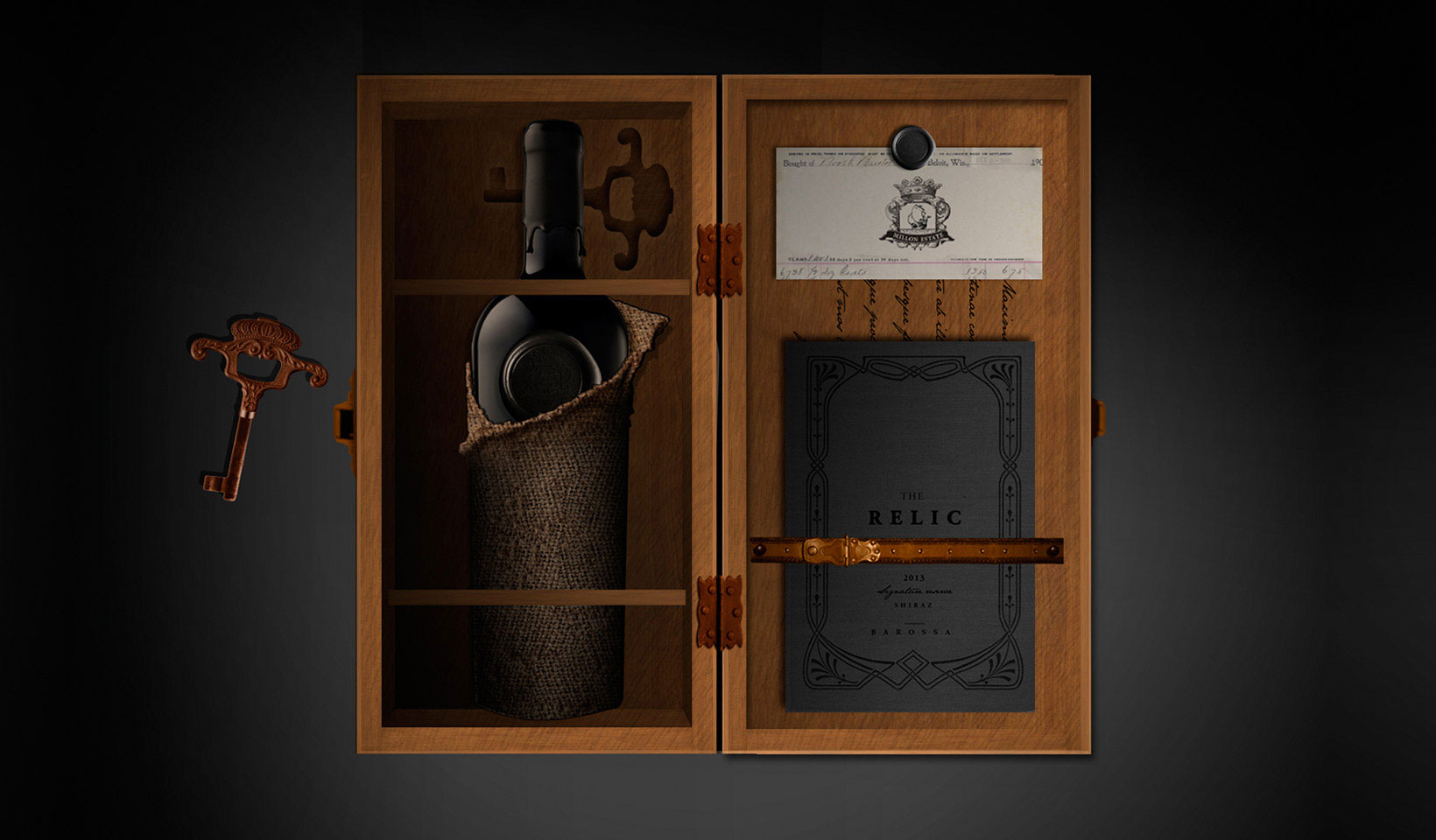 A custom, keepsake wine box houses each ‘find’ - a prized bottle of ‘vintage’ Relic. A custom, hessian bottle-wrap creates a reveal when unwrapping the gift that offers the surprise of a map referencing the wine’s Barossa location. The gift box also contains a document of authenticity, a rustic key - which also works as a corkscrew - and a book which continues the story telling, this time of the vineyard’s heritage and the production journey of this truly exquisite Barossa Shiraz.